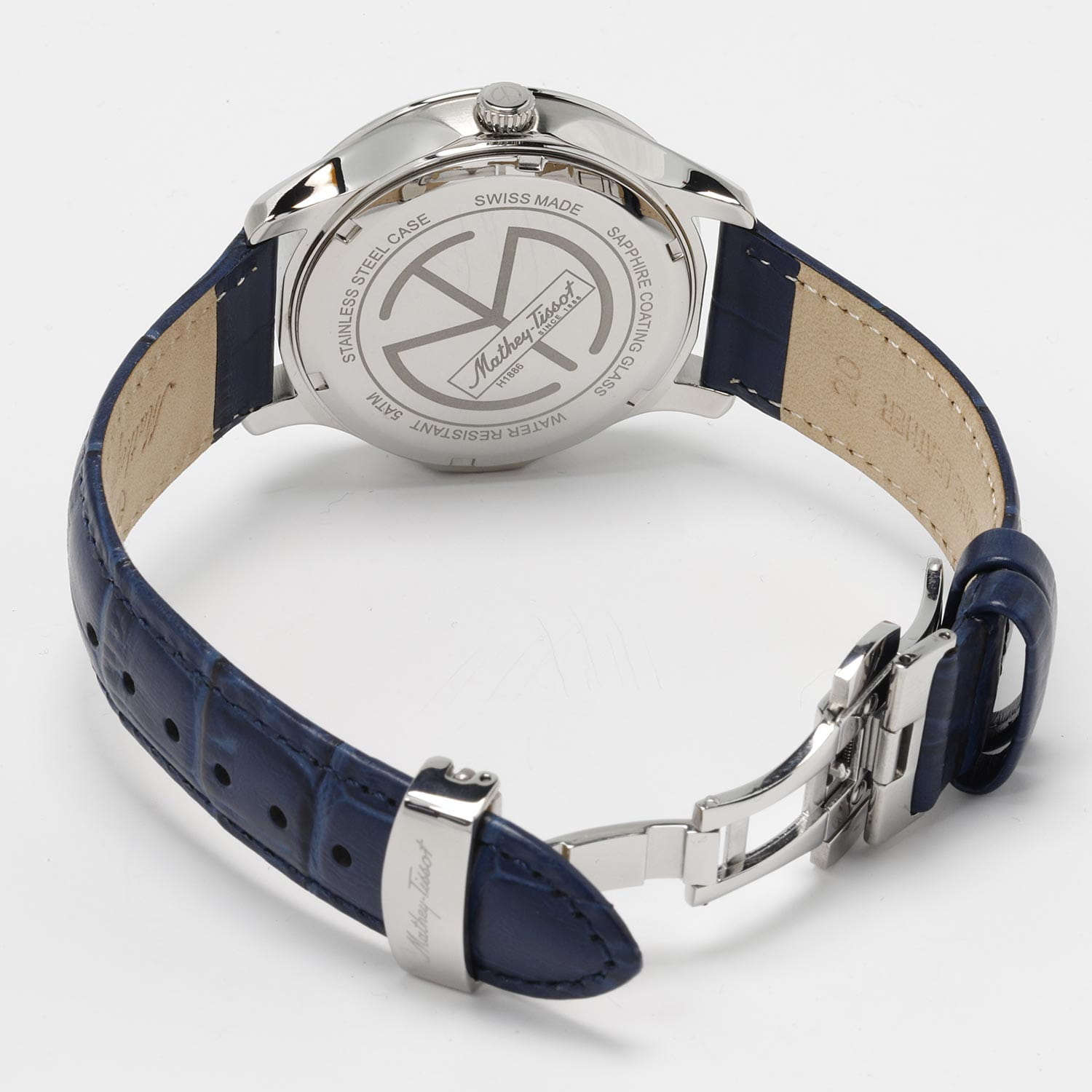 Мужские кварцевые часы Mathey-Tissot Edmond Quartz H1886QABU — это стильное сочетание элегантности и современного дизайна. Изящный корпус выполнен из нержавеющей стали, диаметром 42 мм, что придаст образу элегантности и надежности. Изысканный циферблат с метками в виде штрихов и римских цифр придает модели особый блеск. Циферблат защищен минеральным стекломМинеральное стеклоМинеральное стекло представляет собой искусственно выращенный минерал кварца. Такое стекло отличается особой устойчивостью к повреждениям и царапинам. Уступает по некоторым качествам сапфировому стеклу. с сапфировым покрытием, обеспечивает устойчивость к царапинам. Окошко даты находится в положении 12 часов. Кожаный ремешок с тиснением под кожу аллигатора на застёжке-бабочке с кнопкамиЗастёжка "бабочка"Такой вид застёжки дополняется предохранителями, помогающими избежать случайного раскрытия браслета. Обладают изящным исполнением. , гарантирует комфортное и безопасное ношение. Секундная стрелка вынесена на отдельный циферблат. Рифленая заводная головка. Класс водозащиты: 50 метров позволит защитить корпус от случайных брызг или капель дождя. Mathey-Tissot — отличный выбор для тех, кто ценит утонченность и качество.