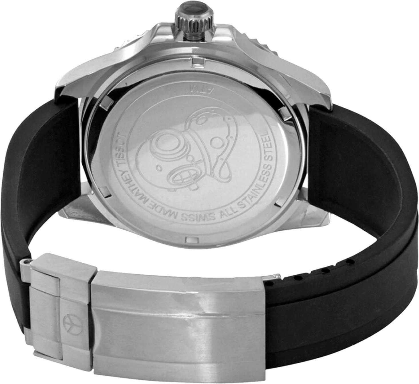 Мужские кварцевые часы Mathey-Tissot Mathy H909ABU— это стильное сочетание элегантности и современного дизайна. Изящный корпус выполнен из нержавеющей стали, диаметром 42 мм, что придаст образу элегантности и надежности. Циферблат с метками в виде точек и арабских цифр придает модели особый блеск. Циферблат защищен минеральным стекломМинеральное стеклоМинеральное стекло представляет собой искусственно выращенный минерал кварца. Такое стекло отличается особой устойчивостью к повреждениям и царапинам. Уступает по некоторым качествам сапфировому стеклу. с сапфировым покрытием, обеспечивает устойчивость к царапинам. Стрелки и метки с люминесцентным покрытиемЛюминесцентное покрытиеПозволяет считывать показания времени в темноте. Производители наносят на стрелки, часовые индексы, безель или поверхность циферблата светонакопительный состав, дающий холодное свечение.. Окошко даты находится в положении 3 часа.  Вращающийся безельБезельВнешний ободок, закрепляющий стекло. В спортивных часах так называется поворотное кольцо с делениями на циферблате, выполняет роль таймера – замеряет отрезки времени на шкале. Неподвижный безель – элемент декора. Однонаправленно вращающийся безель на дайверских часах позволяет фиксировать моменты погружения и выныривания на поверхность. в одном направлении. Часы оснащены надежным кварцевым механизмом. Силиконовый ремешок с раскладной застёжкойРаскладная застёжкаТакой тип застёжки используется только на браслетах из металла. Она никогда не раскрывается полностью, происходит разделение на 2 и более частей. Раскладывающая застёжка снизит вероятность потери часов к минимуму. гарантирует комфортное и безопасное ношение. Класс водозащиты: 200 метров позволит плавать, нырять и заниматься другими водными видами спорта. Mathey-Tissot  — отличный выбор для тех, кто ценит утонченность и качество.