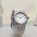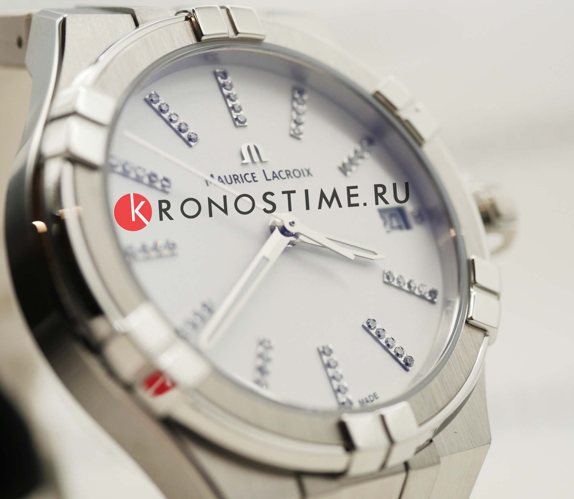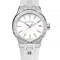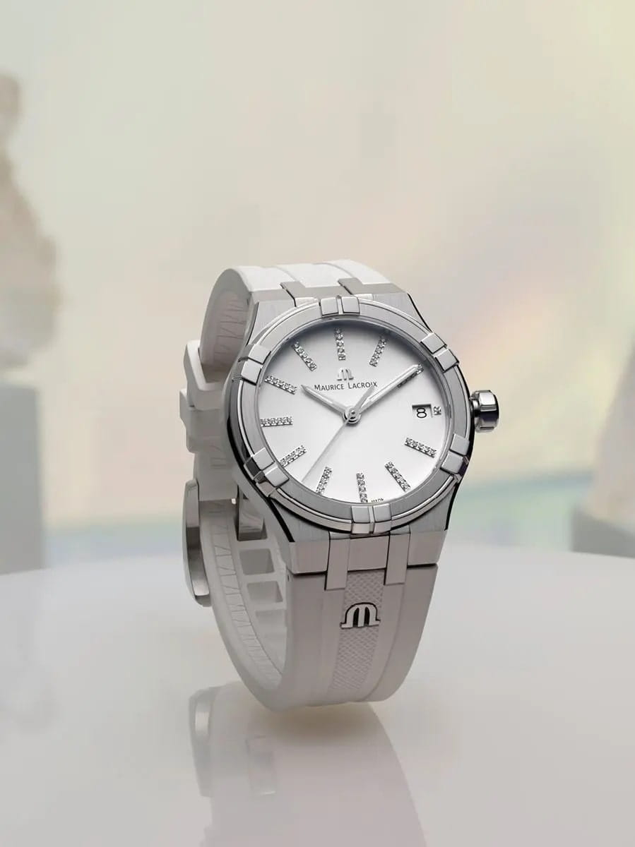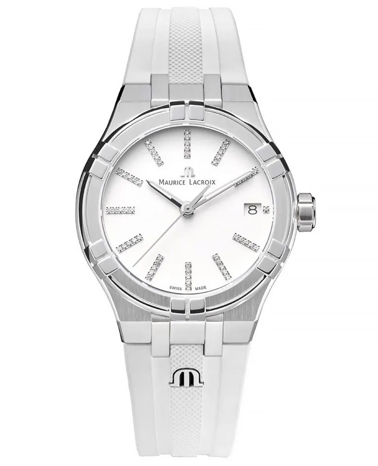 Мужские швейцарские кварцевые часы Maurice Lacroix Aikon Quartz AI1106-SS002-150-1. Сапфировое стеклоСапфировое стеклоПрочный и надёжный материал из кристалла сапфира синтетического происхождения, характеризующийся особой твёрдостью и устойчивостью к царапинам и повреждениям. устойчивое к появлению царапин, обладающее высокой прозрачностью. Белый циферблат. Стрелки с люминесцентным покрытиемЛюминесцентное покрытиеПозволяет считывать показания времени в темноте. Производители наносят на стрелки, часовые индексы, безель или поверхность циферблата светонакопительный состав, дающий холодное свечение.. Метки на циферблате украшены бриллиантами. Класс водозащиты: 100 метров, позволит плавать, нырять и заниматься другими водными видами спорта. Окошко даты находится в положении 3 часов. Корпус и браслет часов изготовлены из стали с частичным. Каучуковый ремешок с классической застежкой.