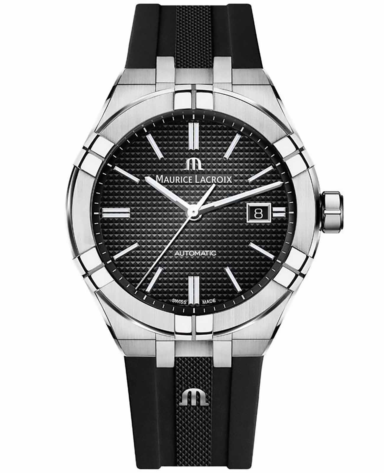 Мужские наручные часы Maurice Lacroix Aikon Automatic AI6008-SS000-330-2 из коллекции Aikon сочетают в себе современный дизайн и надежность швейцарского мастерства. Модель обладает круглым корпусом диаметром 42 мм, выполненным из нержавеющей стали серебристого цвета, что обеспечивает высокую устойчивость к внешним воздействиям . Толщина корпуса составляет всего 11 мм, что делает эти часы компактными и удобными для повседневного ношения. Для защиты используется сапфировое стеклоСапфировое стеклоПрочный и надёжный материал из кристалла сапфира синтетического происхождения, характеризующийся особой твёрдостью и устойчивостью к царапинам и повреждениям., устойчивое к появлению царапин и обладающее высокой прозрачностью благодаря антибликовому покрытиюАнтибликовое покрытиеСлой оксида металла в 0,13-0,3 микрон, благодаря которому стекло часов не бликует и не отражает свет. Антибликовое покрытие уменьшает отражение света в 10 раз, обеспечивая отличную читаемость показателей циферблата. . Часы оснащены черным циферблатом с индексами и функцией вывода даты, что добавляет практичности в использовании. Механизм часов представляет собой автоматический калибр ML115 (основанный на Sellita SW200), работающий с частотой 28'800 полуколебаний в час и обеспечивающий запас хода до 38 часов . Ремешок выполнен из резины, гарантируя комфортное ношение и долговечность. Модель также оснащена водонепроницаемостью до 200 метров, что позволяет использовать их во время плавания, ныряния и других водных видов спорта. Часы подходят как для повседневной носки, так и для занятий спортом, сохраняя при этом элегантный внешний вид.