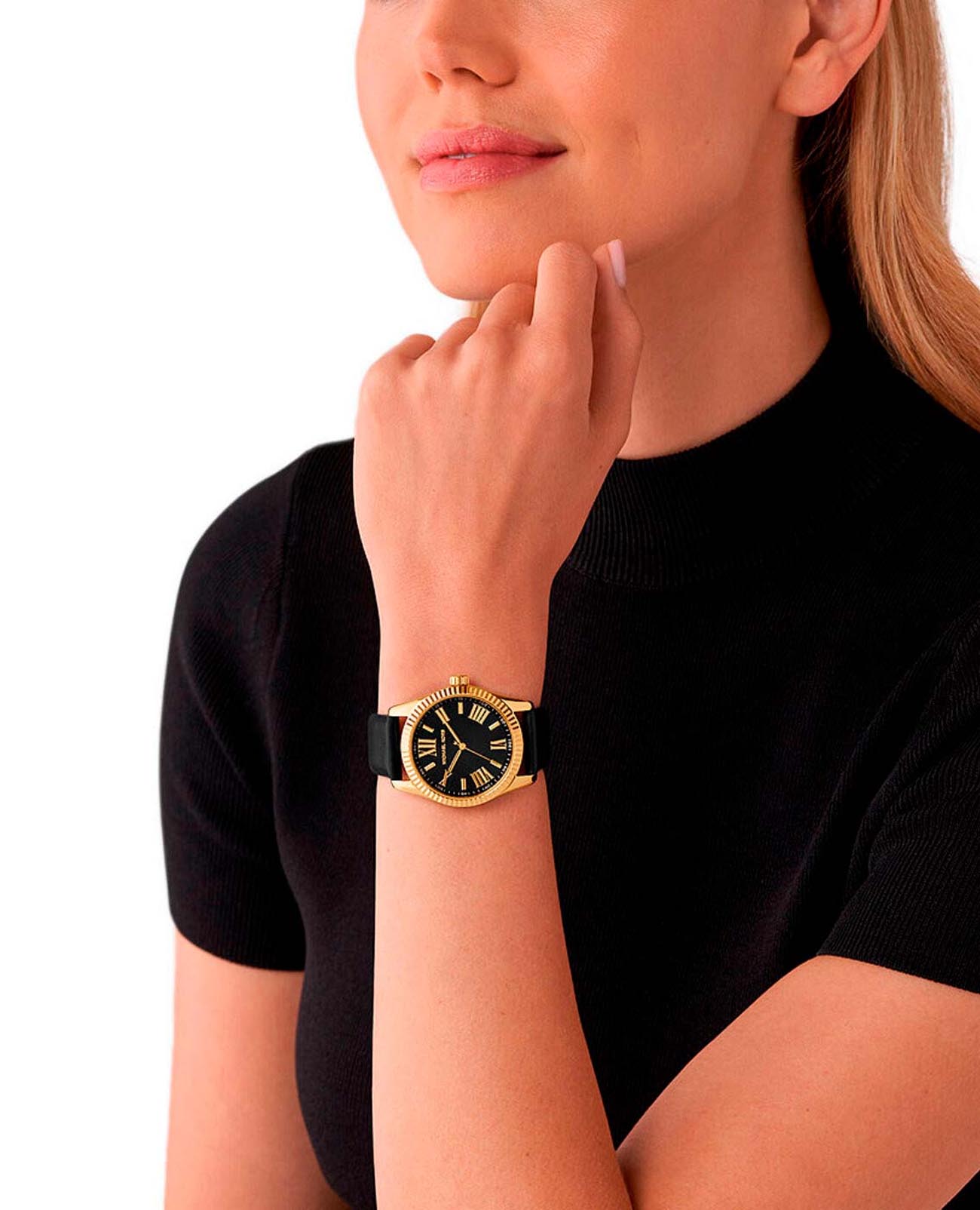 Женские американские часы с минеральным стекломМинеральное стеклоМинеральное стекло представляет собой искусственно выращенный минерал кварца. Такое стекло отличается особой устойчивостью к повреждениям и царапинам. Уступает по некоторым качествам сапфировому стеклу. Michael Kors Lexington MK4748, кварцевый механизм с высокой точностью. Корпус часов изготовлен из нержавеющей стали с PVD-покрытиемPVDУльтратонкое покрытие наносится в технике вакуумного напыления, сочетает в себе нитрид титана особой прочности со слоем золота или оксида хрома. Несёт в себе декоративную или защитную функцию.. БезельБезельВнешний ободок, закрепляющий стекло. В спортивных часах так называется поворотное кольцо с делениями на циферблате, выполняет роль таймера – замеряет отрезки времени на шкале. Неподвижный безель – элемент декора. Однонаправленно вращающийся безель на дайверских часах позволяет фиксировать моменты погружения и выныривания на поверхность. с алмазной гранью. Метки в виде штрихов и римских цифр. Заводная головка с защитой. Класс водозащиты: 100 метров, позволит плавать, нырять и заниматься другими водными видами спорта. Кожаный ремешок на стандартной застёжке.