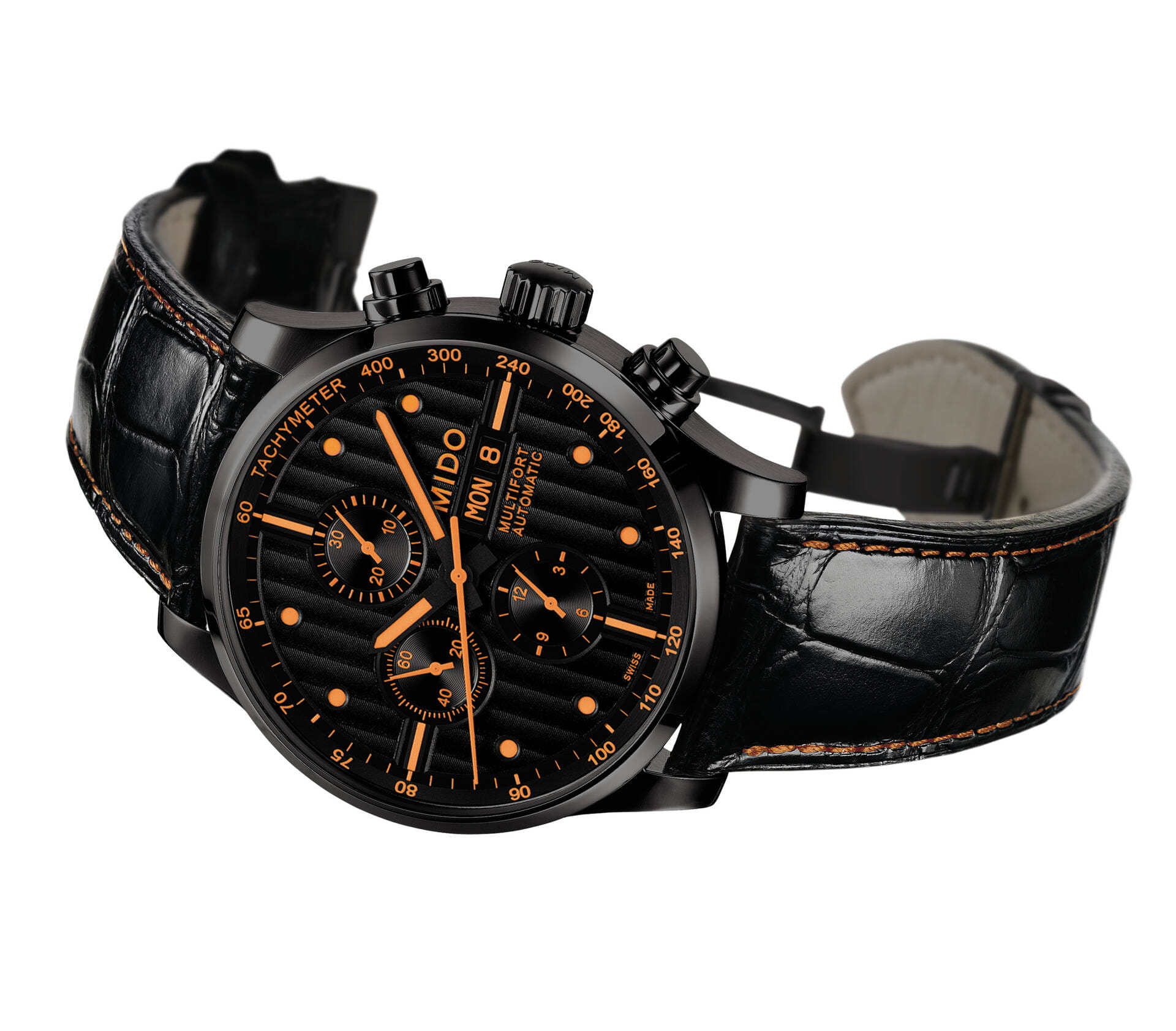 Мужские швейцарские механические часы с хронографом Mido Multifort Chronograph M005.614.36.051.22, механический механизм (автоматический калибр) с высокой точностью. Благодаря трем счетчикам, черному циферблату и оранжевым накладным меткам и стрелкам эти часы-хронограф Multifort Chronograph Special Edition выглядят чрезвычайно эффектно. Сапфировое стекло устойчивое к появлению царапин, обладающее высокой прозрачностью. Класс водозащиты: 100 метров, позволит плавать, нырять и заниматься другими водными видами спорта. Корпус часов изготовлен из стали, с PVD покрытием черного цвета. Прозрачная задняя крышка, завинчивающаяся заводная головка. Часы предлагаются в комплекте с двумя сменными ремешками черного и оранжевого цвета.