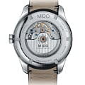 Модель оснащена автоматическим механизмом MIDO Caliber 80 (на базе ETA C07.621), обеспечивающим запас хода до 80 часов. Функционал включает индикацию часов, минут, секунд, дня недели и даты, расположенных в положении «3 часа».