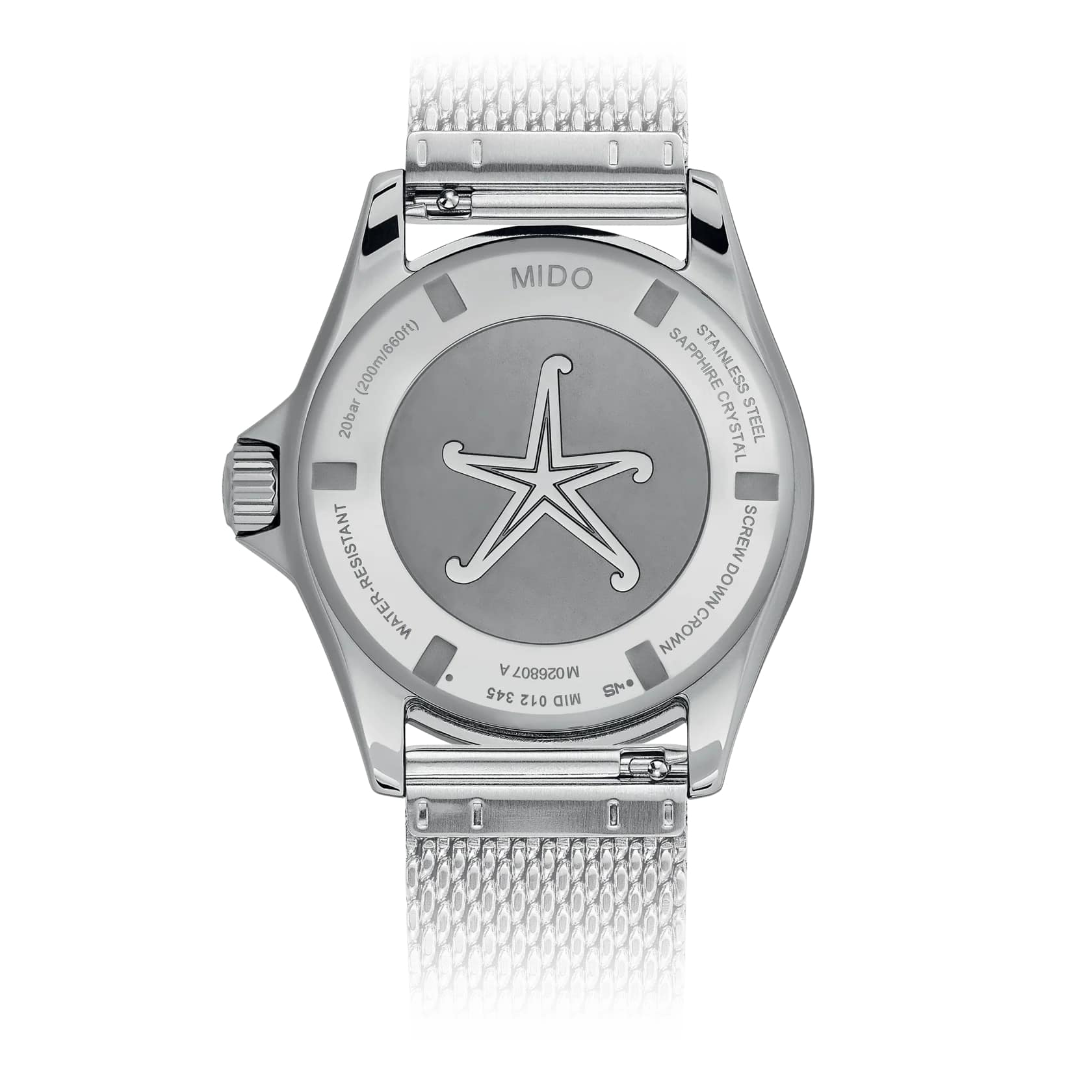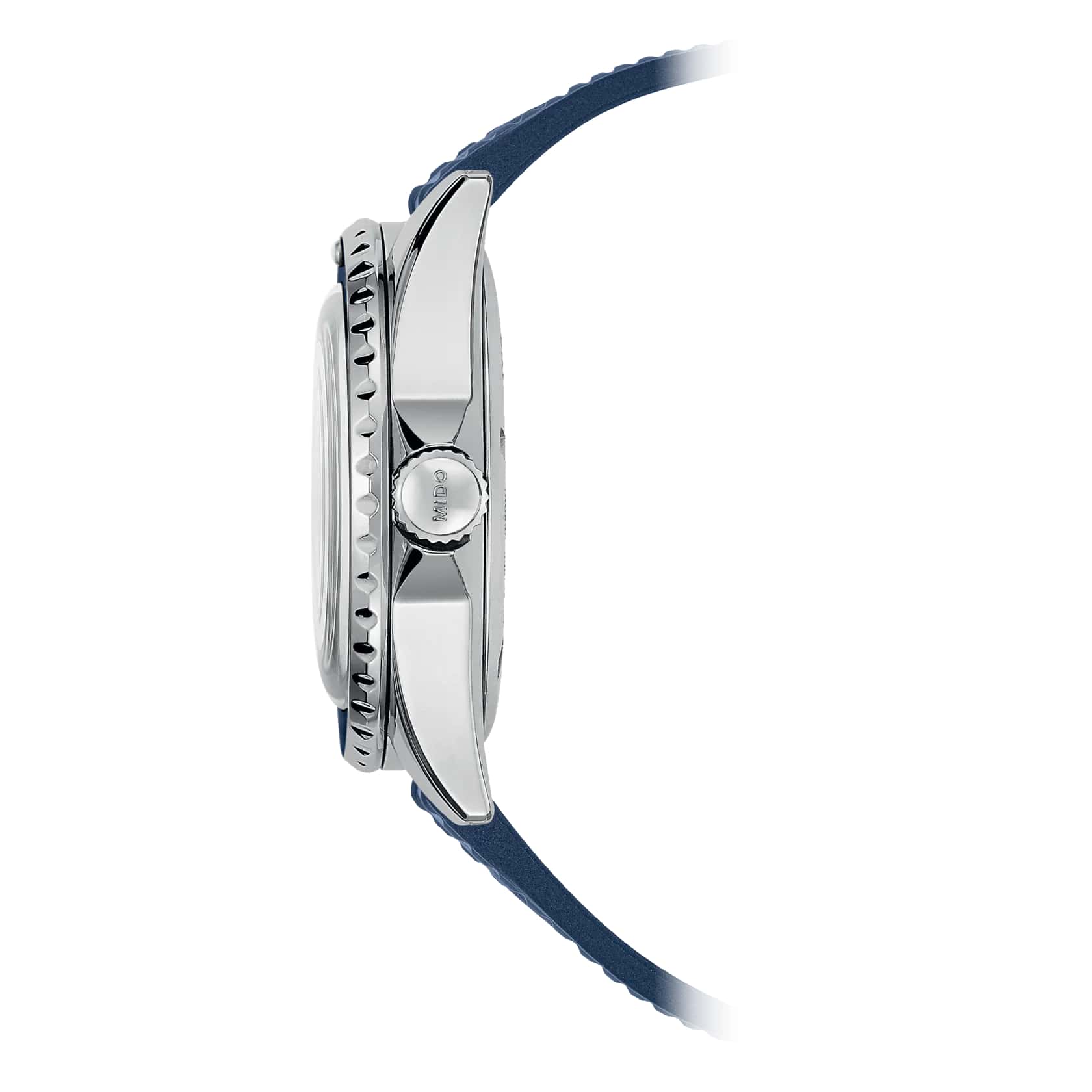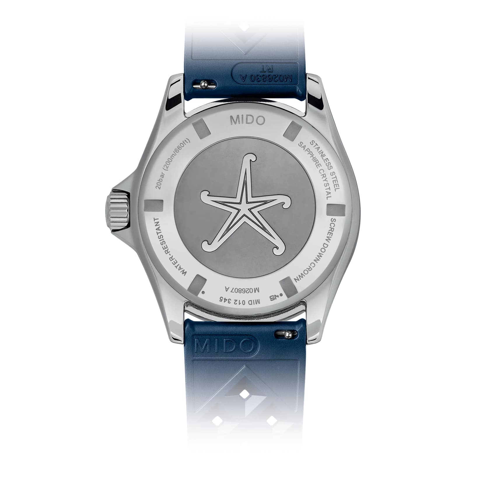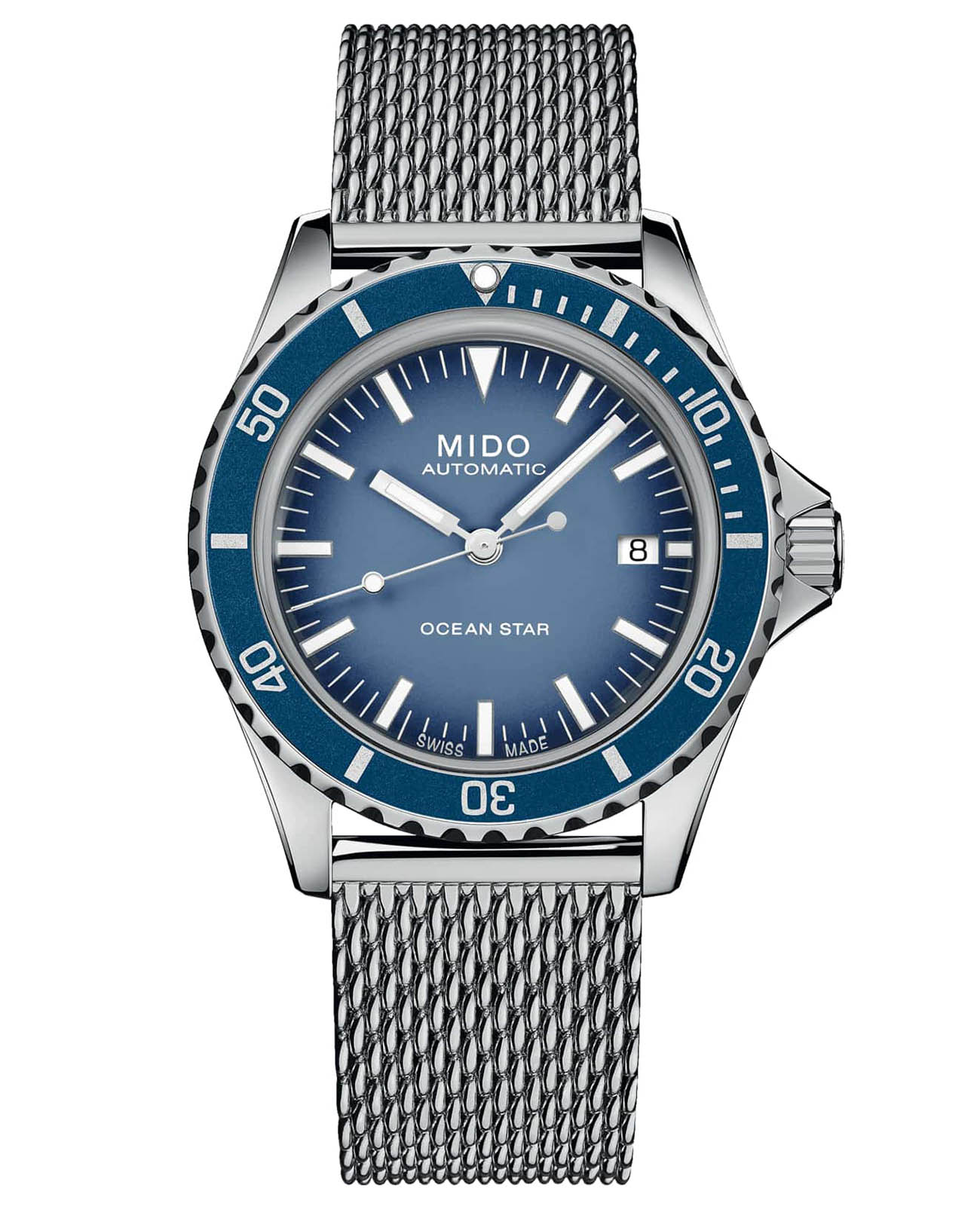 Часы MIDO Ocean Star Tribute (артикул M026.807.11.041.01) — это дань уважения дайверским моделям 1960-х годов, сочетающая винтажный дизайн с современными технологиями. Корпус диаметром 40,5 мм выполнен из нержавеющей стали с водозащитой до 20 бар (200 метров). Завинчивающаяся заводная головка и накладные часовые метки, покрытые Super-LumiNova®Люминесцентное покрытиеПозволяет считывать показания времени в темноте. Производители наносят на стрелки, часовые индексы, безель или поверхность циферблата светонакопительный состав, дающий холодное свечение., обеспечивают надёжность и удобство. Синий градиентный циферблат защищён сапфировым стекломСапфировое стеклоПрочный и надёжный материал из кристалла сапфира синтетического происхождения, характеризующийся особой твёрдостью и устойчивостью к царапинам и повреждениям. с антибликовым покрытием.