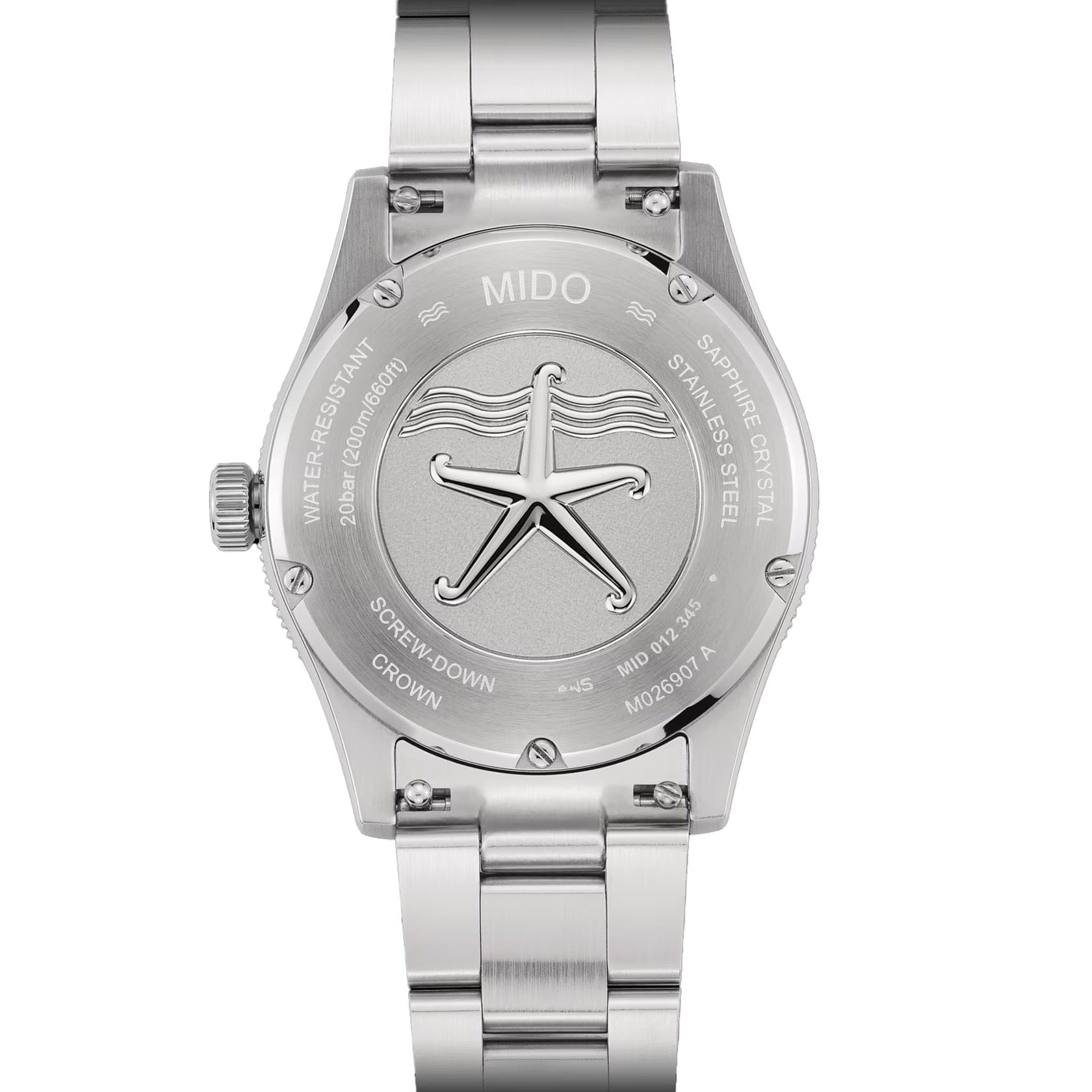 Мужские швейцарские механические часы с сапфировым стеклом Mido Ocean Star 39 M026.907.21.021.00, механический механизм (автоматический калибр) с высокой точностью. Сапфировое стеклоСапфировое стеклоПрочный и надёжный материал из кристалла сапфира синтетического происхождения, характеризующийся особой твёрдостью и устойчивостью к царапинам и повреждениям. устойчивое к появлению царапин, обладающее высокой прозрачностью. Корпус часов изготовлен из стали. Вращающийся безельБезельВнешний ободок, закрепляющий стекло. В спортивных часах так называется поворотное кольцо с делениями на циферблате, выполняет роль таймера – замеряет отрезки времени на шкале. Неподвижный безель – элемент декора. Однонаправленно вращающийся безель на дайверских часах позволяет фиксировать моменты погружения и выныривания на поверхность. из нержавеющей стали с PVDPVDУльтратонкое покрытие наносится в технике вакуумного напыления, сочетает в себе нитрид титана особой прочности со слоем золота или оксида хрома. Несёт в себе декоративную или защитную функцию. покрытием и керамики с покрытием Superluminova. Циферблат украшают метки с бриллиантами. Стрелки с люминесцентным покрытиемЛюминесцентное покрытиеПозволяет считывать показания времени в темноте. Производители наносят на стрелки, часовые индексы, безель или поверхность циферблата светонакопительный состав, дающий холодное свечение.. Окошко даты в положении 3 часов. Класс водозащиты: 200 метров, позволит плавать, нырять и заниматься другими водными видами спорта.