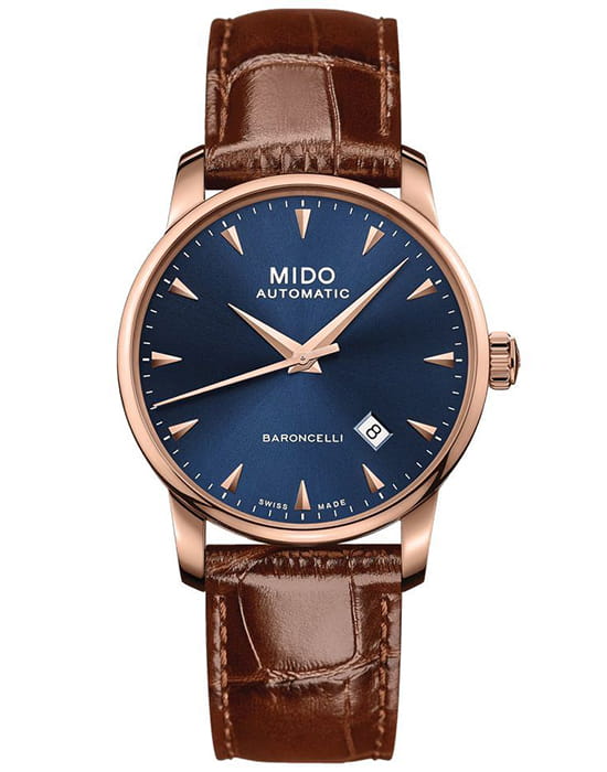 Mido Baroncelli Midnight Blue Gent M8600.3.15.8 — изысканные мужские часы, выполненные в лучших традициях швейцарской часовой школы. Корпус диаметром 38 мм изготовлен из нержавеющей стали с pvd-покрытиемPVDУльтратонкое покрытие наносится в технике вакуумного напыления, сочетает в себе нитрид титана особой прочности со слоем золота или оксида хрома. Несёт в себе декоративную или защитную функцию. цвета розового золота, которое придаёт модели благородное сияние. Элегантный коричневый ремешок из натуральной кожи дополняет образ и обеспечивает комфорт при носке.