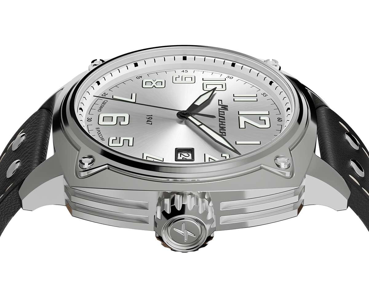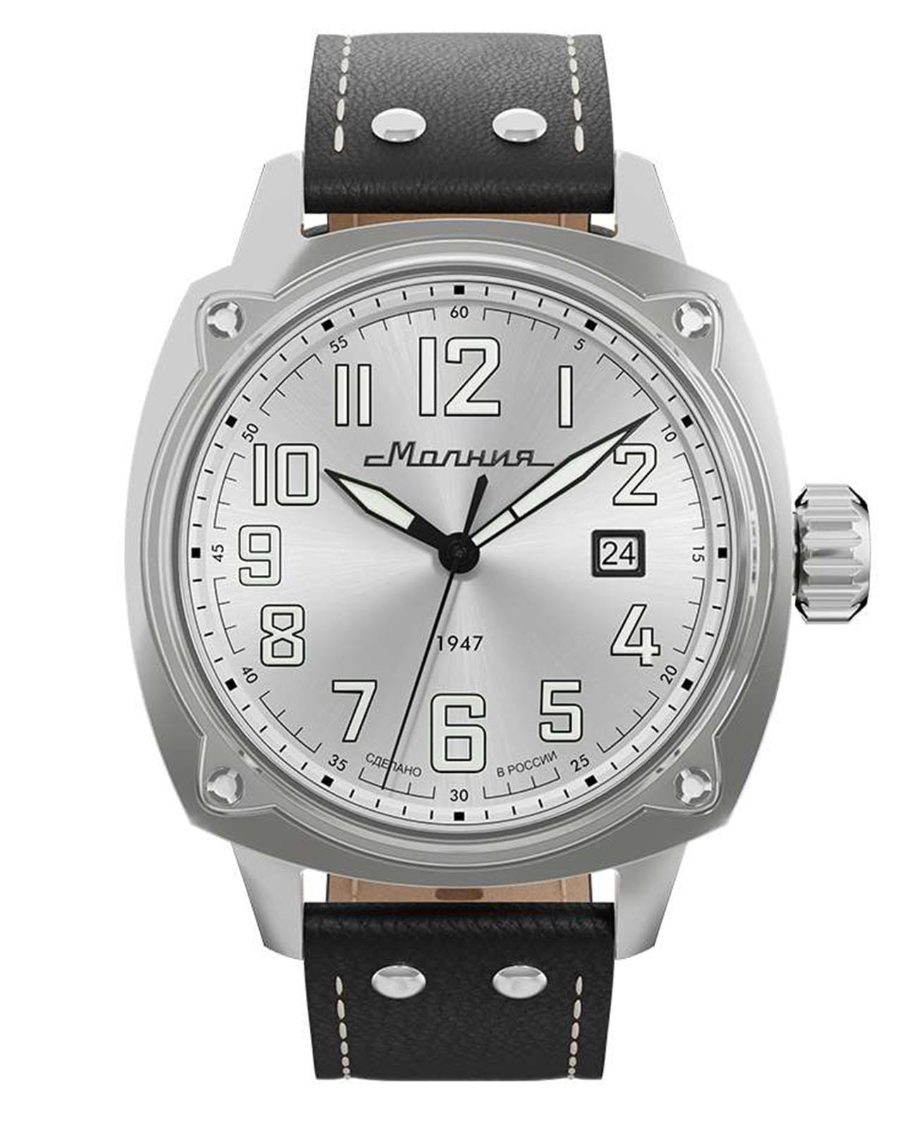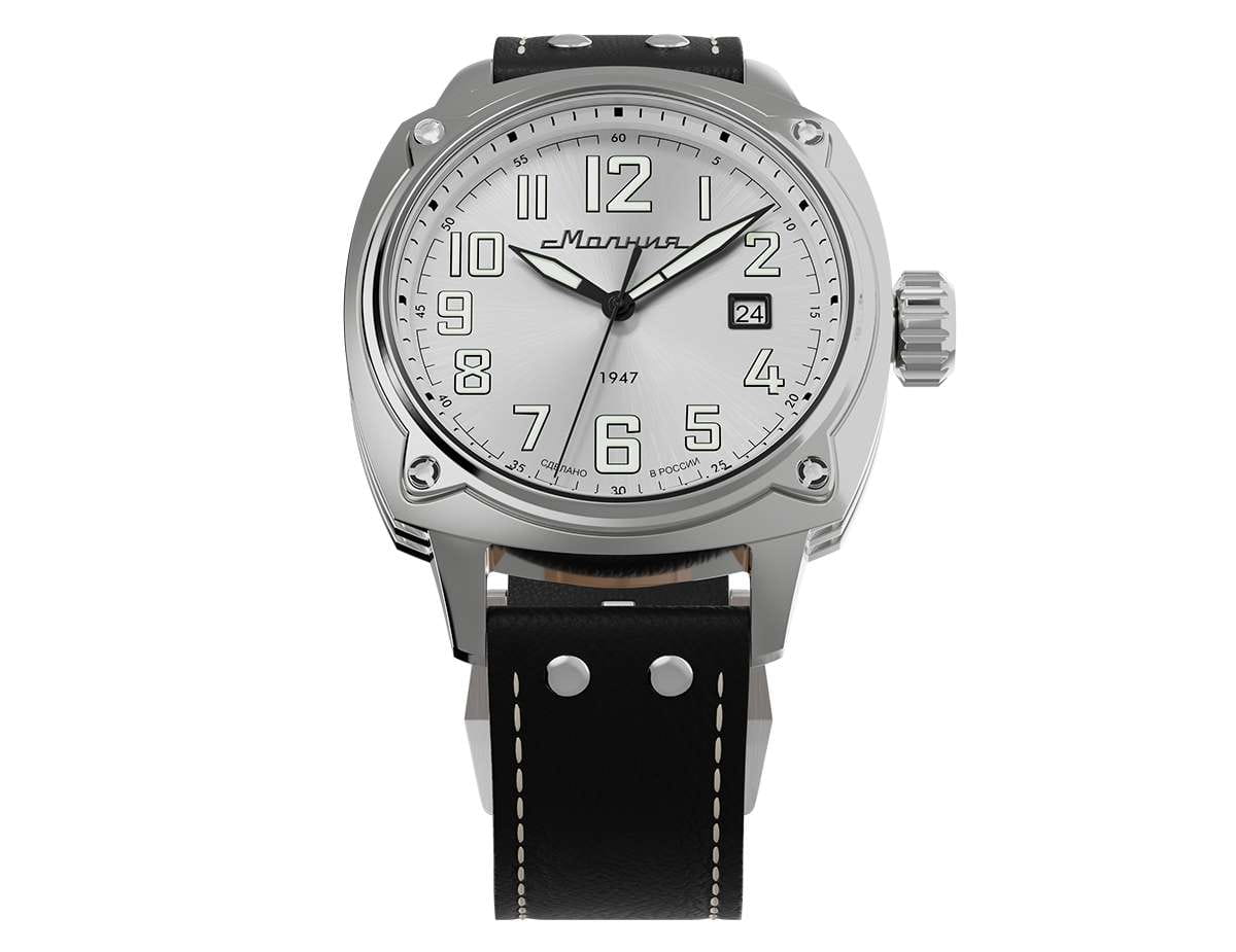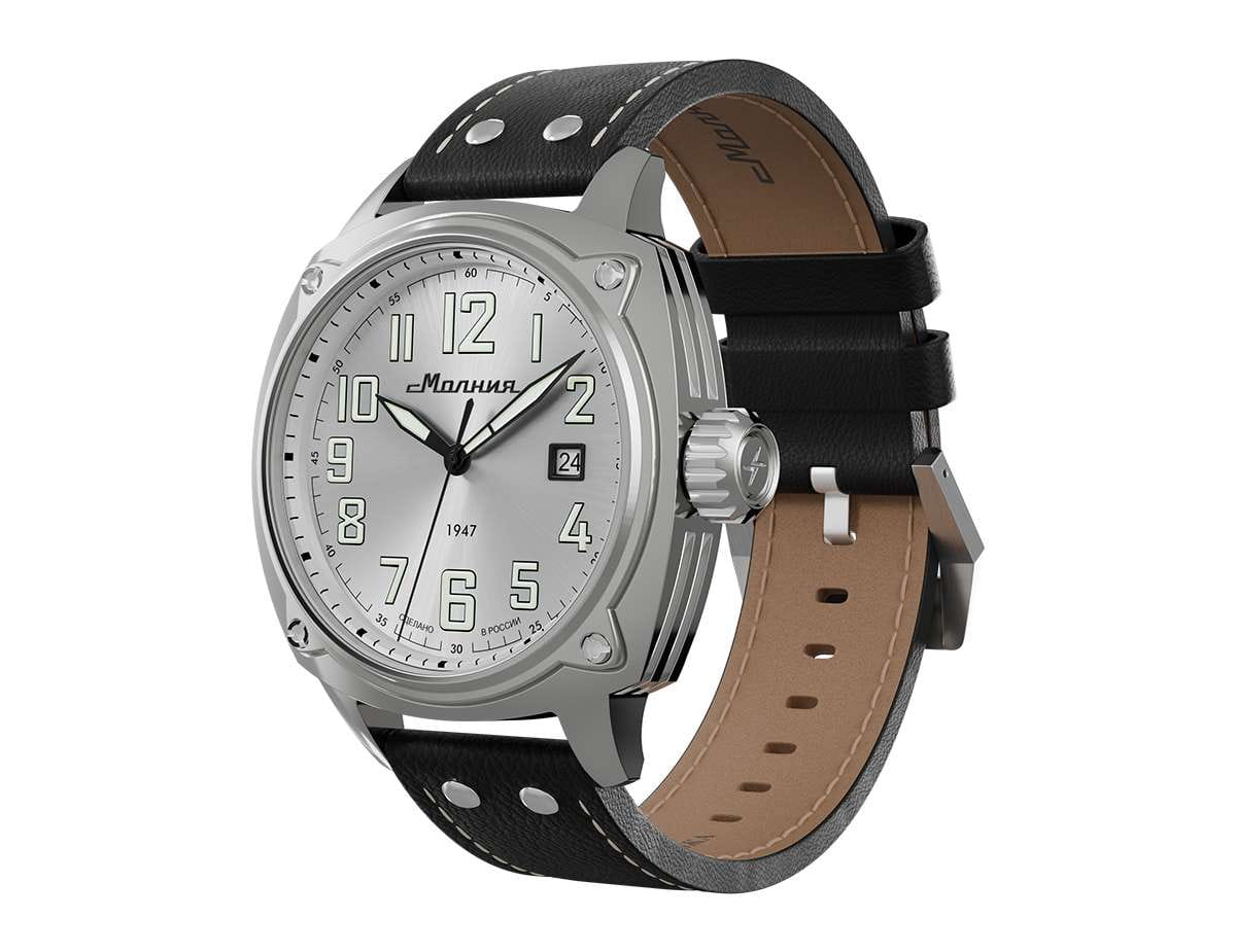 Мужские механические часы с автоподзаводом — это надёжный аксессуар от легендарного бренда «МОЛНИЯ», созданный на Челябинском часовом заводе. Корпус диаметром 42 мм выполнен из нержавеющей стали 316L с зеркальной полировкой. БезельБезельВнешний ободок, закрепляющий стекло. В спортивных часах так называется поворотное кольцо с делениями на циферблате, выполняет роль таймера – замеряет отрезки времени на шкале. Неподвижный безель – элемент декора. Однонаправленно вращающийся безель на дайверских часах позволяет фиксировать моменты погружения и выныривания на поверхность. также выполнен из стали с зеркальной отделкой. Циферблат белого цвета оформлен индексами и стрелками. Окошко даты расположено в положении 3 часов. Стрелки и метки с люминесцентным покрытиемЛюминесцентное покрытиеПозволяет считывать показания времени в темноте. Производители наносят на стрелки, часовые индексы, безель или поверхность циферблата светонакопительный состав, дающий холодное свечение. Super-LumiNova, обеспечивающим хорошую читаемость в темноте. Циферблат защищён сапфировым стекломСапфировое стеклоПрочный и надёжный материал из кристалла сапфира синтетического происхождения, характеризующийся особой твёрдостью и устойчивостью к царапинам и повреждениям. с антибликовым покрытиемАнтибликовое покрытиеСлой оксида металла в 0,13-0,3 микрон, благодаря которому стекло часов не бликует и не отражает свет. Антибликовое покрытие уменьшает отражение света в 10 раз, обеспечивая отличную читаемость показателей циферблата.. Механизм — японский автоматический калибр Miyota 8215 с функцией и запасом хода до 42 часов. Прозрачная задняя крышка позволяет наблюдать за работой механизма. Часы оснащены кожаным ремешком чёрного цвета с белой отстрочкой и классической пряжкой. Водонепроницаемость 100 м позволяет использовать часы для плавания и повседневного ношения. Идеальный выбор для тех, кто ценит качество, точность и стиль.
