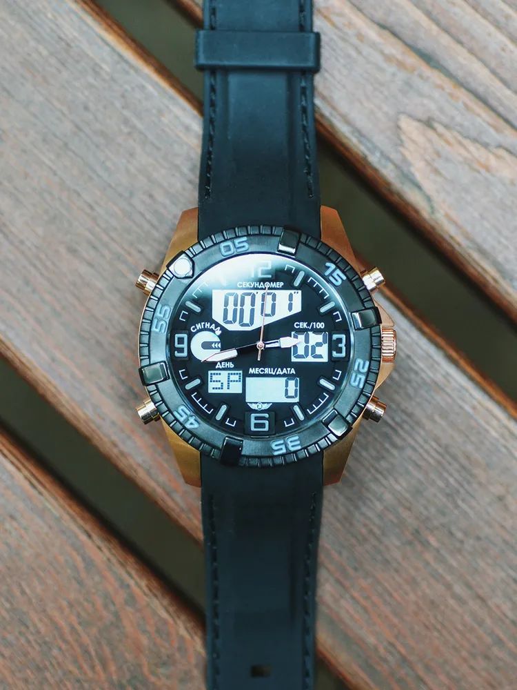 Часы оснащены японским кварцевым механизмом с аналогово-цифровой индикацией, обеспечивая точный ход и дополнительные возможности измерения времени. Циферблат защищён минеральным стекломМинеральное стеклоМинеральное стекло представляет собой искусственно выращенный минерал кварца. Такое стекло отличается особой устойчивостью к повреждениям и царапинам. Уступает по некоторым качествам сапфировому стеклу., устойчивым к царапинам. Установлена классическая застёжка-пряжка, обеспечивая надёжную фиксацию на запястье. Модель обладает водонепроницаемостью до 100 метров, что делает её подходящей для плавания и сноркелинга.