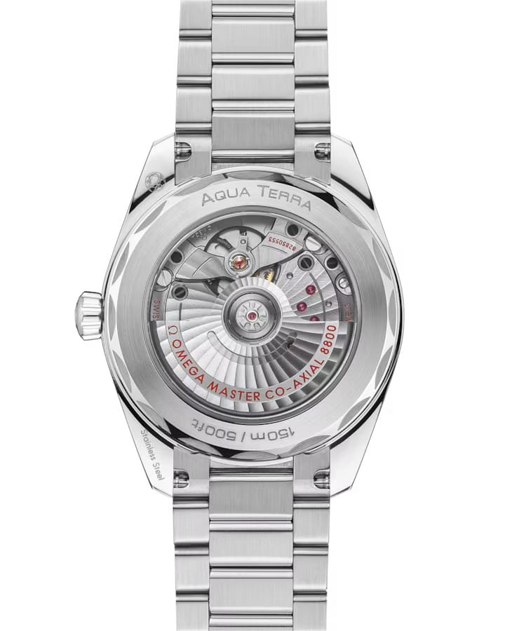 Omega Seamaster Aqua Terra выполнены в симметричном корпусе из нержавеющей стали с завинчивающейся задней крышкой, украшенной волновым узором. Циферблат дополнен окошком даты на 6 часах. Стрелки и метки оснащены люминесцентным покрытиемЛюминесцентное покрытиеПозволяет считывать показания времени в темноте. Производители наносят на стрелки, часовые индексы, безель или поверхность циферблата светонакопительный состав, дающий холодное свечение. Super-LumiNova для лучшей читаемости в темноте. Калибр Omega 8800 сертифицирован как Master Chronometer — гарантия высочайшей точности и устойчивости к магнитным полям. Запас хода составляет 55 часов. Защиту циферблата обеспечивает сапфировое стеклоСапфировое стеклоПрочный и надёжный материал из кристалла сапфира синтетического происхождения, характеризующийся особой твёрдостью и устойчивостью к царапинам и повреждениям. с антибликовым покрытиемАнтибликовое покрытиеСлой оксида металла в 0,13-0,3 микрон, благодаря которому стекло часов не бликует и не отражает свет. Антибликовое покрытие уменьшает отражение света в 10 раз, обеспечивая отличную читаемость показателей циферблата. с обеих сторон. Водозащита позволяет использовать часы в воде без риска повреждения. Часы установлены на полированный и матовый браслет. Это сочетание премиального качества, технологичности и классического дизайна.