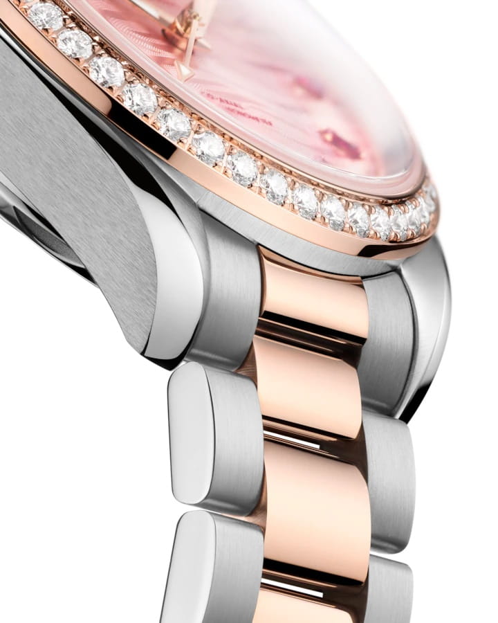 Женские часы Omega Seamaster Aqua Terra выполнены в симметричном корпусе из нержавеющей стали и 18K Sedna™ золота с завинчивающейся задней крышкой, украшенной волновым узором. Безель полирован и инкрустирован бриллиантами, что добавляет модели роскошный акцент. Циферблат нежно-розового цвета имеет текстуру в виде волн и дополнен окошком даты на 6 часах. Часовые стрелки и секундная стрелка выполнены из 18K Sedna™ золота с алмазной полировкой. Индексы — 11 маркизов с рубиновой вставкой, установленных по окружности циферблата. Калибр Omega 8800 сертифицирован как Master Chronometer — гарантия высочайшей точности и устойчивости к магнитным полям. Запас хода составляет 55 часов. Защиту циферблата обеспечивает сапфировое стеклоСапфировое стеклоПрочный и надёжный материал из кристалла сапфира синтетического происхождения, характеризующийся особой твёрдостью и устойчивостью к царапинам и повреждениям. с антибликовым покрытиемАнтибликовое покрытиеСлой оксида металла в 0,13-0,3 микрон, благодаря которому стекло часов не бликует и не отражает свет. Антибликовое покрытие уменьшает отражение света в 10 раз, обеспечивая отличную читаемость показателей циферблата. с обеих сторон. Водозащита позволяет использовать часы в воде без риска повреждения. Часы установлены на интегрированный браслет из нержавеющей стали и 18K Sedna™ золота с застёжкой-бабочкой с кнопкамиЗастёжка "бабочка"Такой вид застёжки дополняется предохранителями, помогающими избежать случайного раскрытия браслета. Обладают изящным исполнением. . Вес модели — около 109 грамм. Это сочетание премиального качества, технологичности и классического дизайна.