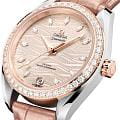 Часы Omega Seamaster Aqua Terra выполнены в симметричном корпусе из нержавеющей стали и 18K Sedna™ золота с завинчивающейся задней крышкой, украшенной волновым узором. Модель дополнена полированным безелем с бриллиантами, что добавляет роскошный акцент. Циферблат золотистого цвета оформлен с использованием волнообразного рисунка и имеет окошко даты на 6 часах. Стрелки выполнены из 18K Sedna™ золота с алмазной полировкой. Часовые метки — 11 бриллиантов в маркизной оправе, что подчёркивает элегантность модели. Калибр Omega 8800 сертифицирован как Master Chronometer — гарантия высочайшей точности и устойчивости к магнитным полям. Запас хода составляет 55 часов. Защиту циферблата обеспечивает сапфировое стеклоСапфировое стеклоПрочный и надёжный материал из кристалла сапфира синтетического происхождения, характеризующийся особой твёрдостью и устойчивостью к царапинам и повреждениям. с антибликовым покрытиемАнтибликовое покрытиеСлой оксида металла в 0,13-0,3 микрон, благодаря которому стекло часов не бликует и не отражает свет. Антибликовое покрытие уменьшает отражение света в 10 раз, обеспечивая отличную читаемость показателей циферблата. с обеих сторон. Водозащита позволяет использовать часы в воде без риска повреждения. Часы установлены на кожаный ремешок бежевого цвета. Это сочетание премиального качества, технологичности и классического дизайна.