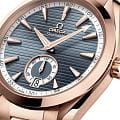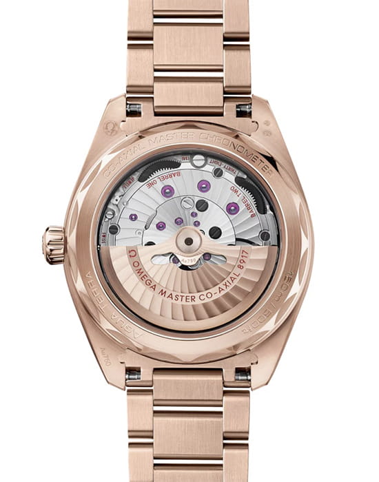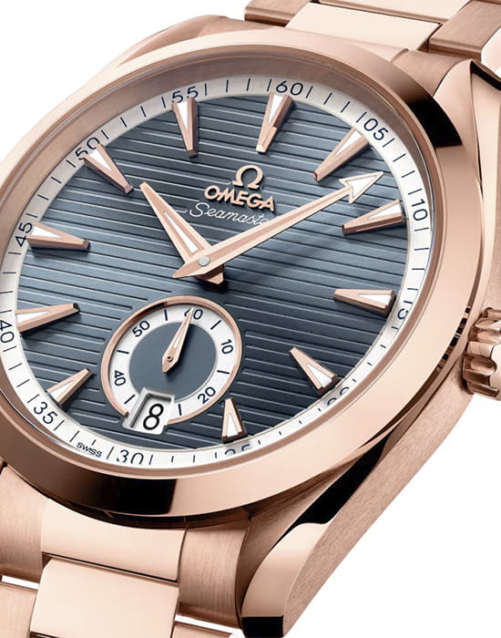 Мужские наручные часы Omega Seamaster Aqua Terra выполнены в корпусе из 18K Sedna™ золота , диаметром 41 мм , толщиной 13,2 мм , ширина между ушками — 20 мм , общий вес составляет около 229 граммов. Циферблат с горизонтальным узором «тиковое дерево» имеет окошко даты в положении 6 часов и дополнительный циферблат малой секундной стрелки с черным кольцом. Стрелки и индексы выполнены из 18К Sedna™ золота и покрыты белым люминесцентным составом Super-LumiNovaЛюминесцентное покрытиеПозволяет считывать показания времени в темноте. Производители наносят на стрелки, часовые индексы, безель или поверхность циферблата светонакопительный состав, дающий холодное свечение., обеспечивающим читаемость в темноте. Минутная шкала и малый циферблат дополнительно обработаны пескоструйным методом для повышения контраста. Стекло — выпуклое сапфировое стекло сапфировое стеклоСапфировое стеклоПрочный и надёжный материал из кристалла сапфира синтетического происхождения, характеризующийся особой твёрдостью и устойчивостью к царапинам и повреждениям. с двусторонним антибликовым покрытием антибликовое покрытиеАнтибликовое покрытиеСлой оксида металла в 0,13-0,3 микрон, благодаря которому стекло часов не бликует и не отражает свет. Антибликовое покрытие уменьшает отражение света в 10 раз, обеспечивая отличную читаемость показателей циферблата., задняя крышка прозрачная, украшена волнообразным узором. Механизм — механический с автоподзаводом , калибр OMEGA Master Chronometer 8917 , сертифицированный METAS и COSC. Обладает запасом хода до 60 часов , антимагнитными свойствами и точностью от 0 до +5 секунд в сутки благодаря коаксиальному спуску и балансу из кремния. Мосты и платина механизма имеют родиевое покрытие и декор Женевские волны. Водозащита — 15 АТМ (150 метров) , что позволяет использовать часы в воде, включая плавание. Часы оснащены золотым браслетом с полированной и матовой отделкой звеньев, застёжка — раскладная, с функцией быстрого регулирования. Это технологичная модель для делового и активного образа жизни, сочетающая морское наследие, швейцарское качество и современные стандарты исполнения.