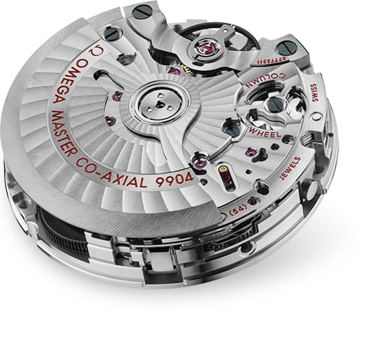 , а также стрелку даты с красным контуром. Уникальный указатель фаз Луны на "6 часах" с диском из авантюринового стекла и золотыми изображениями обоих полушарий дополняет космическую эстетику. Точность обеспечивает калибр OMEGA Master Chronometer 9904, сертифицированный METAS — воплощение инноваций в часовом искусстве.