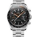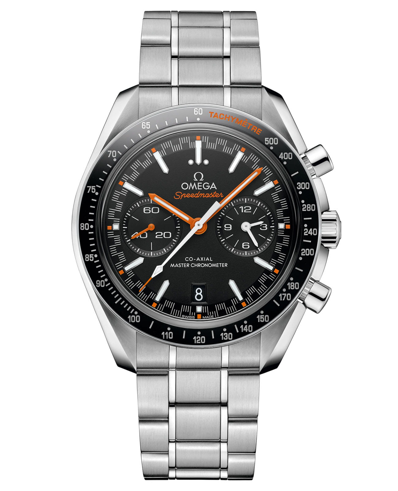 Speedmaster Racing Master Chronometer в 44,25-мм корпусе с браслетом из нержавеющей стали воплощает гоночную эстетику. Черное керамическое кольцоБезельВнешний ободок, закрепляющий стекло. В спортивных часах так называется поворотное кольцо с делениями на циферблате, выполняет роль таймера – замеряет отрезки времени на шкале. Неподвижный безель – элемент декора. Однонаправленно вращающийся безель на дайверских часах позволяет фиксировать моменты погружения и выныривания на поверхность. с тахиметрической шкалойТахиметрРазмеченная шкала, располагается на ободке или безеле часов. Тахиметр позволяет рассчитать скорость на определённом участке пути, расстояние измеряется в километрах или милях. сочетает оранжевые надписи с цифрами из Liquidmetal™. Матовый черный циферблат с "спидометрной" минутной шкалой дополнен индексами из белого золота18-каратное золотоОбозначение по каратной системе пробирования, оно показывает, сколько драгоценного металла содержится в изделии. 18 карат - в составе 75% чистого золота, соответствует 750 пробе.