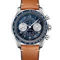 Коллекция Chronoscope искусно переосмысливает наследие OMEGA, соединяя эстетику хронографов 1940-х с культовым стилем Speedmaster. 43-мм корпус из нержавеющей стали с синим безелемБезельВнешний ободок, закрепляющий стекло. В спортивных часах так называется поворотное кольцо с делениями на циферблате, выполняет роль таймера – замеряет отрезки времени на шкале. Неподвижный безель – элемент декора. Однонаправленно вращающийся безель на дайверских часах позволяет фиксировать моменты погружения и выныривания на поверхность. из анодированного алюминия обрамляет насыщенный синий циферблат, где серебристые счетчики гармонируют со спиралевидным узором и арабскими цифрами с родиевым покрытием. Изящные стрелки в форме листьев дополняют винтажный образ. Циферблат украшают три исторические шкалы в форме улитки: тахиметрическаяТахиметрРазмеченная шкала, располагается на ободке или безеле часов. Тахиметр позволяет рассчитать скорость на определённом участке пути, расстояние измеряется в километрах или милях., пульсометрическая и телеметрическая. На позиции "9 часов" расположен счетчик малых секунд, а на "3 часах" - 60-минутный и 12-часовой индикаторы. Часы дополнены коричневым кожаным ремешком в винтажном стиле и оснащены передовым калибром OMEGA Co-Axial Master Chronometer 9908, где традиции встречаются с инновациями.