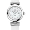 формы "альфа" и 11 сверкающих бриллиантовых индексов танцуют на переливающемся циферблате из белого перламутра, словно солнечные блики на морской глади. Окошко даты на "3 часах" добавляет практичности, сохраняя безупречную эстетику. Внутри этой поэзии из стали и света бьется сердце истинной леди — коаксиальный механизм OMEGA калибра 8520, символ вечной женственности и часового совершенства.
