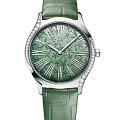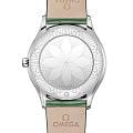 OMEGA Trésor с цветочным вдохновением — это поэтичное сочетание ювелирного искусства и природной гармонии. 36-мм корпус из полированной нержавеющей стали, украшенный 38 бриллиантами (0,49 карата), словно роса на лепестках, переливается при каждом движении. Под выпуклым сапфировым стекломСапфировое стеклоПрочный и надёжный материал из кристалла сапфира синтетического происхождения, характеризующийся особой твёрдостью и устойчивостью к царапинам и повреждениям. раскрывается циферблат с зеленым PVD-покрытиемPVDУльтратонкое покрытие наносится в технике вакуумного напыления, сочетает в себе нитрид титана особой прочности со слоем золота или оксида хрома. Несёт в себе декоративную или защитную функцию. и изысканным лазерным узором жасмина — символом чистоты и изящества. Заводная головка с бриллиантом и родиевые стрелки добавляют благородный блеск. Переливающийся зеленый кожаный ремешок с застежкой из стали завершает образ, а зеркальная задняя крышка с узором "Her Time" скрывает точный кварцевый механизм OMEGA 4061 — воплощение женственности и часового мастерства.