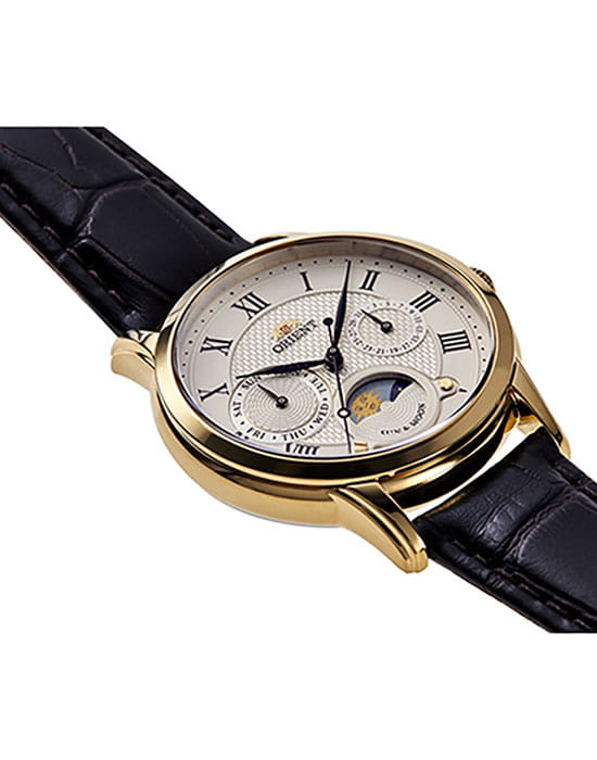 Наручные часы являются отражением винтажного стиля, гильошированный белый циферблат дополнен тонкими римскими цифрами, изысканности придаёт классический чёрный ремешок из натуральной кожи. Уникальность модели в нижнем окошке с изображением луны и солнца, так дизайнеры красиво преподносят нам смену дня и ночи. Кварцевый высокоточный калибр Orient KUE00. Сапфировое стекло. Водозащита до 5 бар. Корпус из хирургической стали 316L с цветным PVD-финишемPVDУльтратонкое покрытие наносится в технике вакуумного напыления, сочетает в себе нитрид титана особой прочности со слоем золота или оксида хрома. Несёт в себе декоративную или защитную функцию. золотистого оттенка. Отображение числа и дня недели. Диаметр корпуса: 43,8 мм.