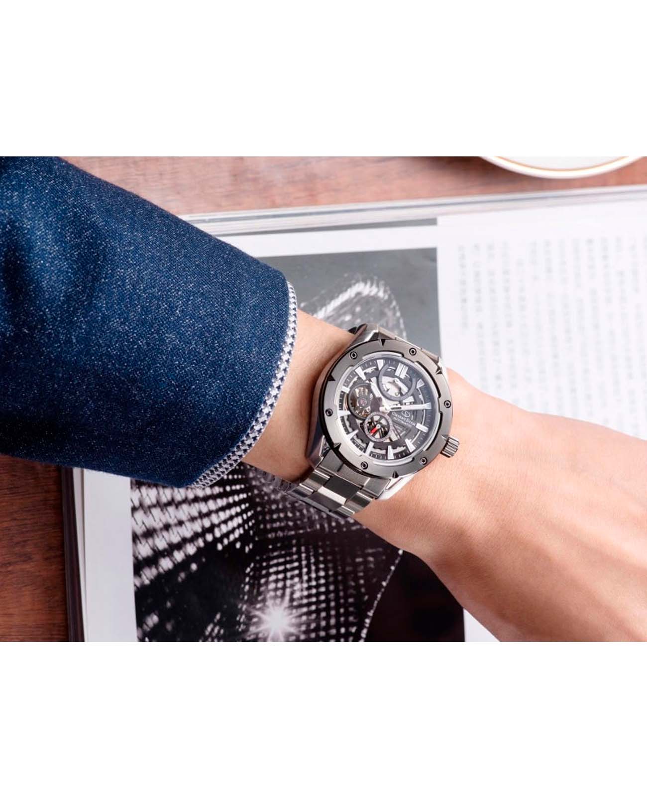 Мужские механические часы с автоподзаводом Orient Contemporary RK-AV0A01B — это стильный и функциональный аксессуар, сочетающий в себе современный дизайн и передовые технологии. Часы оснащены сапфировым стекломСапфировое стеклоПрочный и надёжный материал из кристалла сапфира синтетического происхождения, характеризующийся особой твёрдостью и устойчивостью к царапинам и повреждениям., которое обеспечивает превосходную видимость циферблата и высокую устойчивость к царапинам. Корпус и браслет выполнены из нержавеющей стали, что подчеркивает их долговечность, прочность и элегантность. БезельБезельВнешний ободок, закрепляющий стекло. В спортивных часах так называется поворотное кольцо с делениями на циферблате, выполняет роль таймера – замеряет отрезки времени на шкале. Неподвижный безель – элемент декора. Однонаправленно вращающийся безель на дайверских часах позволяет фиксировать моменты погружения и выныривания на поверхность. с PVD-покрытиемPVDУльтратонкое покрытие наносится в технике вакуумного напыления, сочетает в себе нитрид титана особой прочности со слоем золота или оксида хрома. Несёт в себе декоративную или защитную функцию., украшенный стильными винтами, добавляет часам современный и брутальный вид.