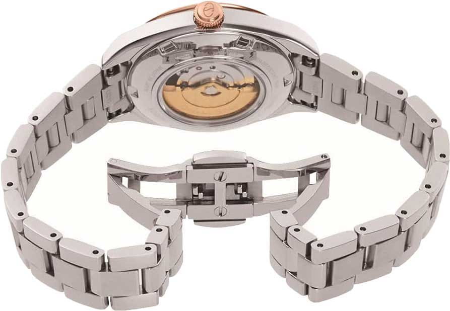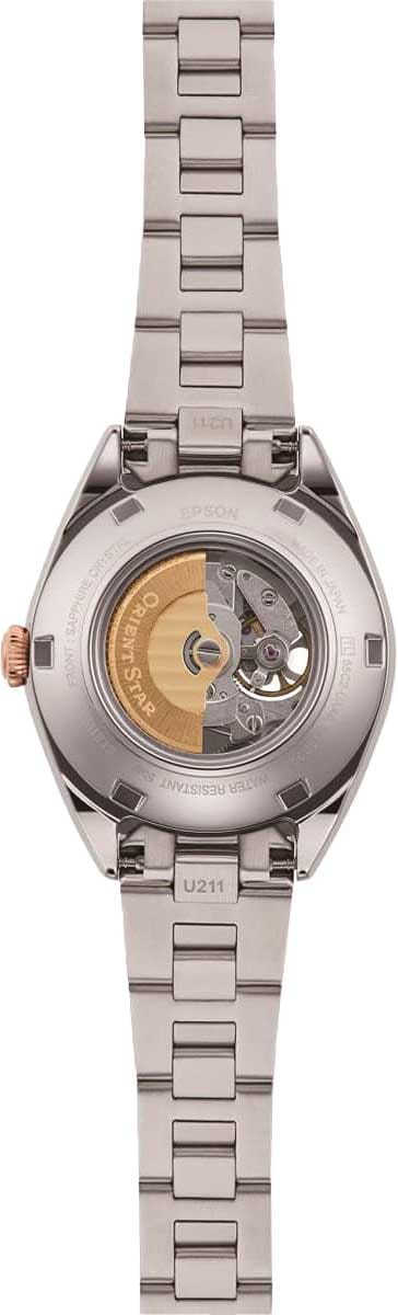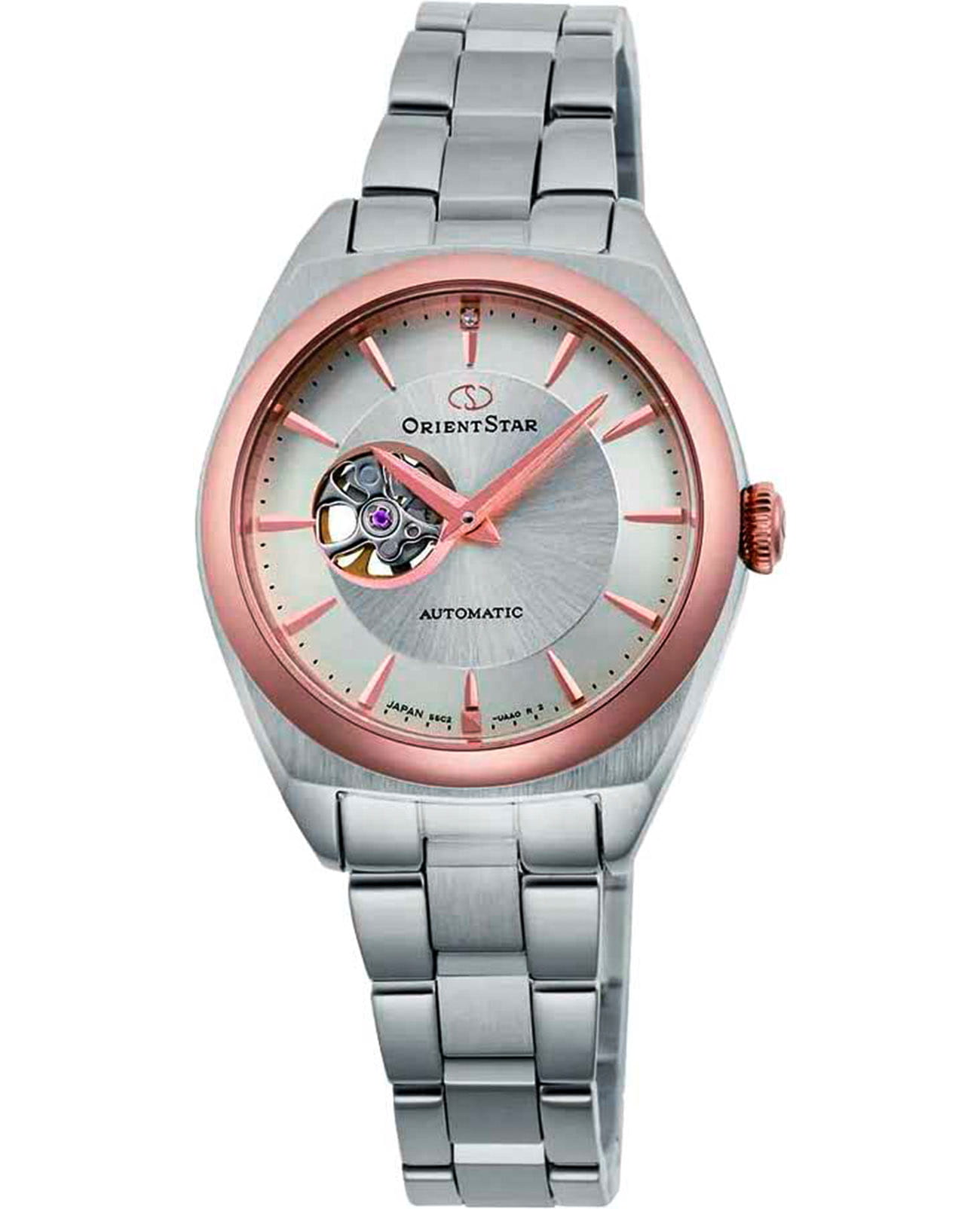 Женские механические часы с автоподзаводом Orient Star — изящный скелетон в японском исполнении. Корпус из нержавеющей стали. БезельБезельВнешний ободок, закрепляющий стекло. В спортивных часах так называется поворотное кольцо с делениями на циферблате, выполняет роль таймера – замеряет отрезки времени на шкале. Неподвижный безель – элемент декора. Однонаправленно вращающийся безель на дайверских часах позволяет фиксировать моменты погружения и выныривания на поверхность. из нержавеющей стали с IP-покрытиемIP-покрытиеМетод ионного напыления. Демонстрирует повышенную устойчивость к истиранию, окислению и химическим веществам. Под воздействием высокого давления и температуры около 1500°C молекулы металла надёжно соединяются с частицами корпуса часов. цвета розового золота, диаметром 30 мм. Циферблат — серебристый, с текстурой Sunray, штриховыми метками и кристаллом на отметке 12; сквозь прозрачное окошко виден баланс механизма. Стекло — сапфировоеСапфировое стеклоПрочный и надёжный материал из кристалла сапфира синтетического происхождения, характеризующийся особой твёрдостью и устойчивостью к царапинам и повреждениям. с антибликовым покрытием. Браслет — стальной 316L на раскладной застёжкеРаскладная застёжкаТакой тип застёжки используется только на браслетах из металла. Она никогда не раскрывается полностью, происходит разделение на 2 и более частей. Раскладывающая застёжка снизит вероятность потери часов к минимуму.. Водонепроницаемость 50 м. Идеальный выбор для тех, кто ценит японское качество и утончённый дизайн.