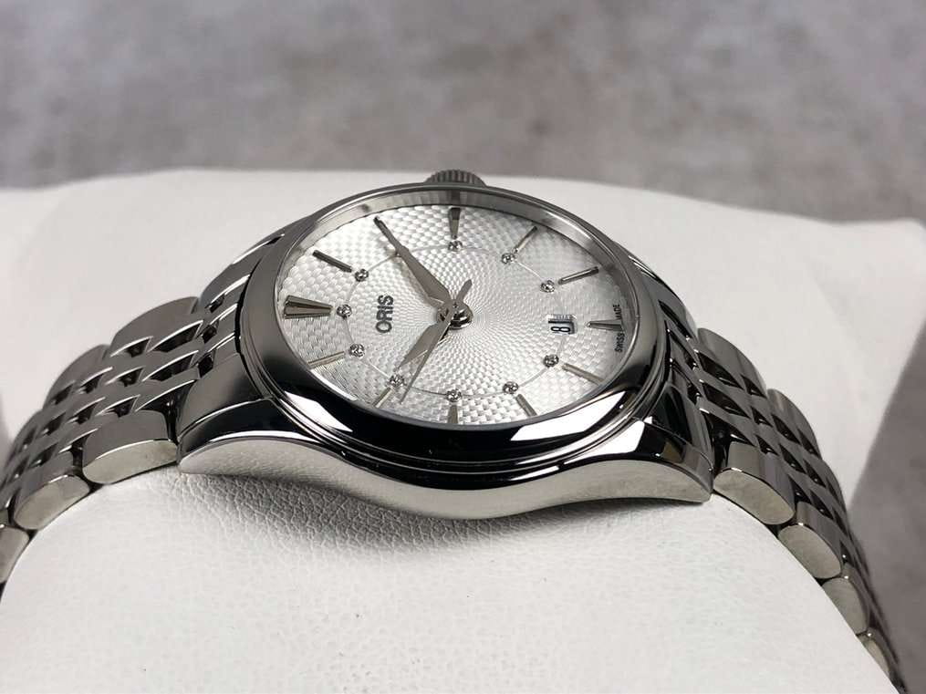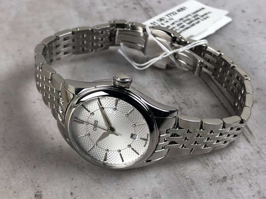 Oris 01 561 7722 4051-07 8 14 79 Artelier – это элегантные часы, сочетающие в себе классический дизайн и современную функциональность. Корпус из нержавеющей стали диаметром 28 мм идеально подходит для тех, кто ценит утонченность и стиль. Сапфировое стеклоСапфировое стеклоПрочный и надёжный материал из кристалла сапфира синтетического происхождения, характеризующийся особой твёрдостью и устойчивостью к царапинам и повреждениям. с антибликовым покрытием защищает циферблат от царапин и обеспечивает отличную читаемость при любом освещении. Стальной браслет на застёжке-бабочке с кнопкамиЗастёжка "бабочка"Такой вид застёжки дополняется предохранителями, помогающими избежать случайного раскрытия браслета. Обладают изящным исполнением. идеально дополняет дизайн часов, обеспечивая комфортное ношение. Часы оснащены центральной секундной стрелкой и окошком даты в положении «6 часов», что делает их функциональными для повседневного использования. Часы обладают водонепроницаемостью в 5 бар (50 метров). Каждая из этих функций прекрасно отображается на потрясающем циферблате, украшенном накладными индексами, гладкими стрелками из нержавеющей стали с бриллиантами 0,0152 карата, установленными в маркерах, и легендарным логотипом Oris.