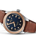 Многокомпонентный корпус из бронзы и стали, вращающийся безельБезельВнешний ободок, закрепляющий стекло. В спортивных часах так называется поворотное кольцо с делениями на циферблате, выполняет роль таймера – замеряет отрезки времени на шкале. Неподвижный безель – элемент декора. Однонаправленно вращающийся безель на дайверских часах позволяет фиксировать моменты погружения и выныривания на поверхность. с минутной шкалой . Сапфировое стеклоСапфировое стеклоПрочный и надёжный материал из кристалла сапфира синтетического происхождения, характеризующийся особой твёрдостью и устойчивостью к царапинам и повреждениям., выпуклое с обеих сторон, внутреннее антибликовое покрытие. Прозрачная задняя крышка из сапфирового стеклаСапфировое стеклоПрочный и надёжный материал из кристалла сапфира синтетического происхождения, характеризующийся особой твёрдостью и устойчивостью к царапинам и повреждениям.. Стрелки и метки с люминесцентным покрытиемЛюминесцентное покрытиеПозволяет считывать показания времени в темноте. Производители наносят на стрелки, часовые индексы, безель или поверхность циферблата светонакопительный состав, дающий холодное свечение.. Завинчивающаяся заводная головка.