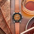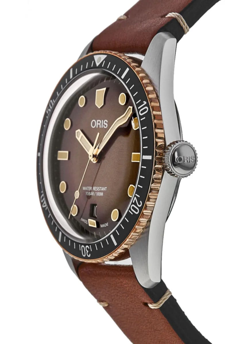 Многокомпонентный бронзовый корпус, вращающийся безельБезельВнешний ободок, закрепляющий стекло. В спортивных часах так называется поворотное кольцо с делениями на циферблате, выполняет роль таймера – замеряет отрезки времени на шкале. Неподвижный безель – элемент декора. Однонаправленно вращающийся безель на дайверских часах позволяет фиксировать моменты погружения и выныривания на поверхность. с минутной шкалой . Сапфировое стеклоСапфировое стеклоПрочный и надёжный материал из кристалла сапфира синтетического происхождения, характеризующийся особой твёрдостью и устойчивостью к царапинам и повреждениям., выпуклое с обеих сторон, внутреннее антибликовое покрытие. Прозрачная задняя крышка из сапфирового стеклаСапфировое стеклоПрочный и надёжный материал из кристалла сапфира синтетического происхождения, характеризующийся особой твёрдостью и устойчивостью к царапинам и повреждениям.. Стрелки с люминесцентным покрытиемЛюминесцентное покрытиеПозволяет считывать показания времени в темноте. Производители наносят на стрелки, часовые индексы, безель или поверхность циферблата светонакопительный состав, дающий холодное свечение.. Завинчивающаяся заводная головка.