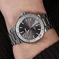 Многокомпонентный корпус из нержавеющей стали, керамический безельБезельВнешний ободок, закрепляющий стекло. В спортивных часах так называется поворотное кольцо с делениями на циферблате, выполняет роль таймера – замеряет отрезки времени на шкале. Неподвижный безель – элемент декора. Однонаправленно вращающийся безель на дайверских часах позволяет фиксировать моменты погружения и выныривания на поверхность. с минутной шкалой. Сапфировое стеклоСапфировое стеклоПрочный и надёжный материал из кристалла сапфира синтетического происхождения, характеризующийся особой твёрдостью и устойчивостью к царапинам и повреждениям., выпуклое с обеих сторон, внутреннее антибликовое покрытие. Стрелки и метки с люминесцентным покрытиемЛюминесцентное покрытиеПозволяет считывать показания времени в темноте. Производители наносят на стрелки, часовые индексы, безель или поверхность циферблата светонакопительный состав, дающий холодное свечение.. Завинчивающаяся прозрачная задняя крышка из минерального стеклаМинеральное стеклоМинеральное стекло представляет собой искусственно выращенный минерал кварца. Такое стекло отличается особой устойчивостью к повреждениям и царапинам. Уступает по некоторым качествам сапфировому стеклу..