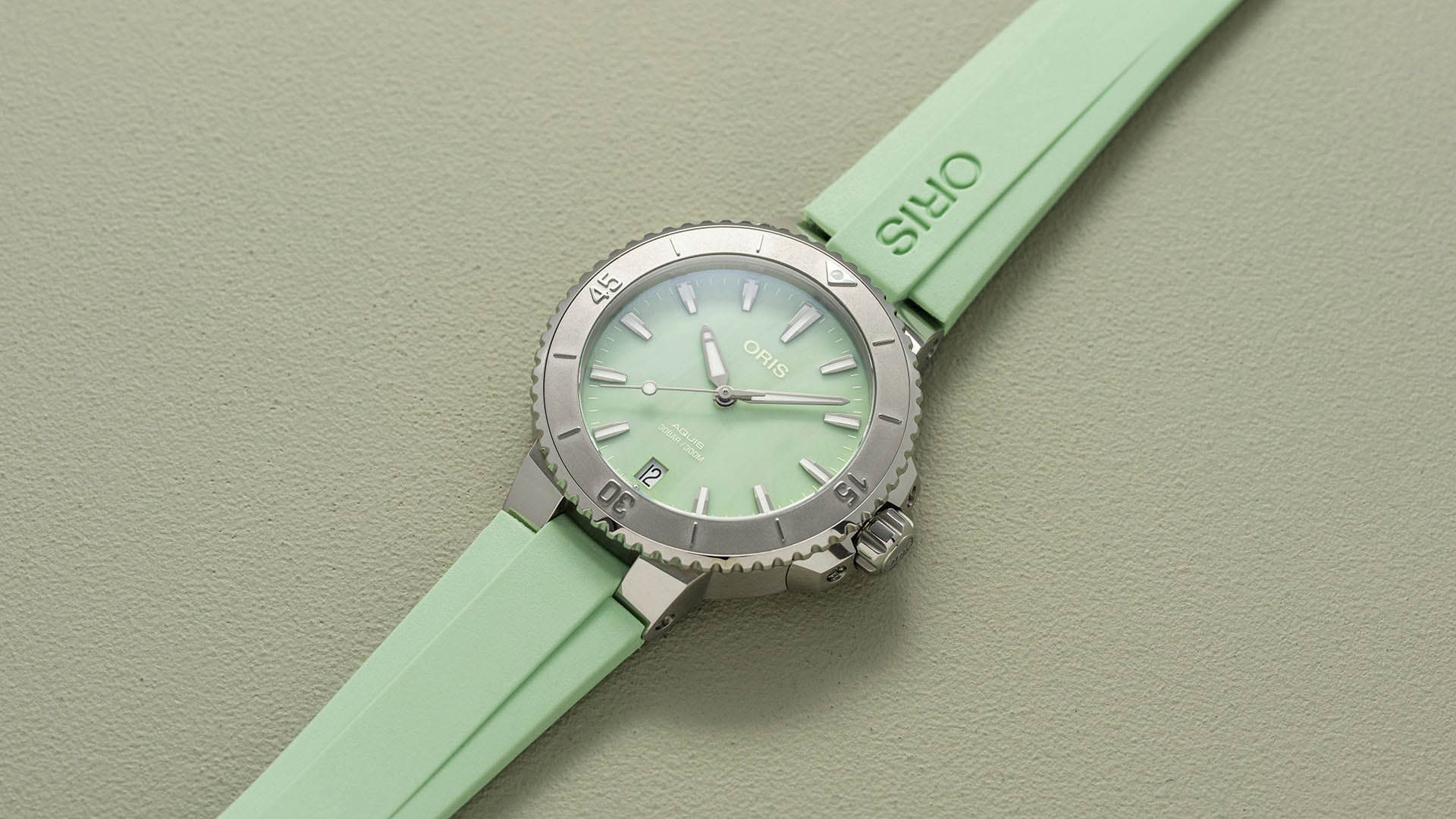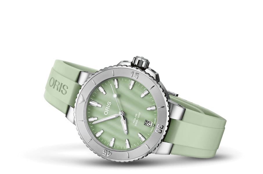 Зеленые дайверские часы Aquis Date цвета морской волны отличаются контрастным циферблатом. Выполненный из перламутра, он переливается, как вода на закате, придавая элегантность высокопроизводительным часам. Эти часы со знакомым коническим силуэтом являются отличительным элементом коллекции Aquis.
