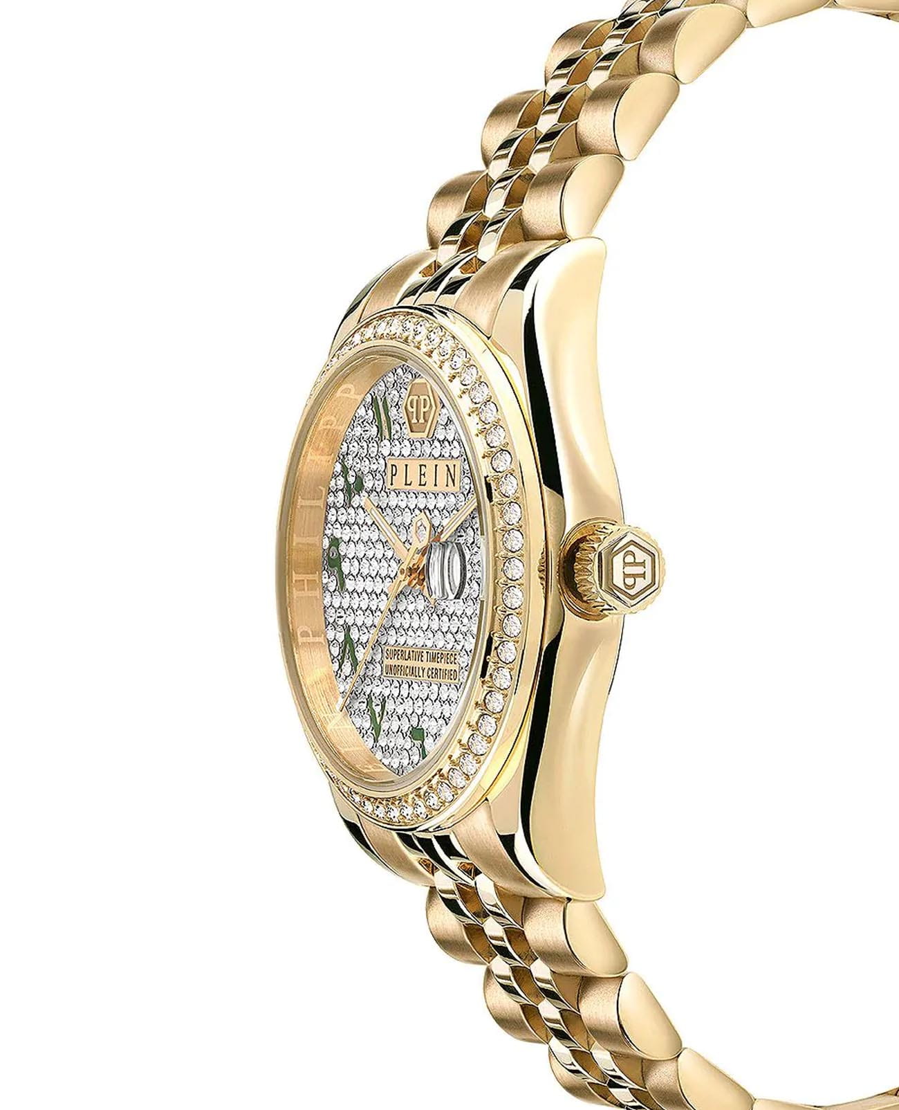 Стильные женские часы Philipp Plein Street Couture PW2BA0223 с надежным кварцевым механизмом. Корпус часов изготовлен из нержавеющей стали с IP-покрытиемIP-покрытиеМетод ионного напыления. Демонстрирует повышенную устойчивость к истиранию, окислению и химическим веществам. Под воздействием высокого давления и температуры около 1500°C молекулы металла надёжно соединяются с частицами корпуса часов.. Минеральное стеклоМинеральное стеклоМинеральное стекло представляет собой искусственно выращенный минерал кварца. Такое стекло отличается особой устойчивостью к повреждениям и царапинам. Уступает по некоторым качествам сапфировому стеклу. устойчивое к мелким механическим повреждениям. Влагозащита: 50 метров, позволит защитить корпус от случайных брызг или капель дождя. Стрелки с люминесцентным покрытиемЛюминесцентное покрытиеПозволяет считывать показания времени в темноте. Производители наносят на стрелки, часовые индексы, безель или поверхность циферблата светонакопительный состав, дающий холодное свечение.. Стальной браслет на застёжке-бабочке с кнопкамиЗастёжка "бабочка"Такой вид застёжки дополняется предохранителями, помогающими избежать случайного раскрытия браслета. Обладают изящным исполнением. . Циферблат и безельБезельВнешний ободок, закрепляющий стекло. В спортивных часах так называется поворотное кольцо с делениями на циферблате, выполняет роль таймера – замеряет отрезки времени на шкале. Неподвижный безель – элемент декора. Однонаправленно вращающийся безель на дайверских часах позволяет фиксировать моменты погружения и выныривания на поверхность. инкрустированы кристаллами Preciosa. Окошко даты находится в положении 3 часа.