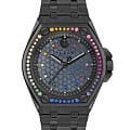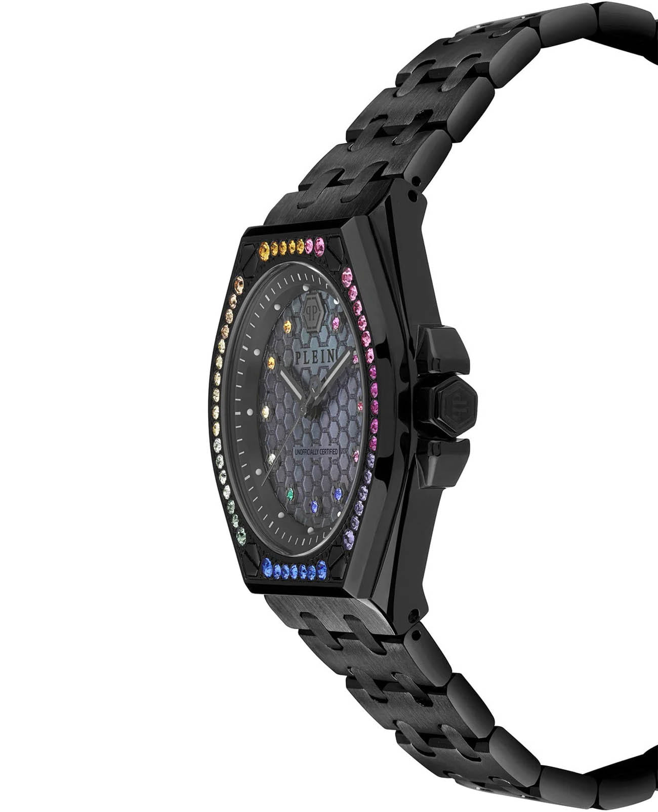 Женкие кварцевые часы Philipp Plein Extreme PWJAA1423. Корпус и браслет часов изготовлены из нержавеющей стали с IP-покрытиемIP-покрытиеМетод ионного напыления. Демонстрирует повышенную устойчивость к истиранию, окислению и химическим веществам. Под воздействием высокого давления и температуры около 1500°C молекулы металла надёжно соединяются с частицами корпуса часов. . Минеральное стеклоМинеральное стеклоМинеральное стекло представляет собой искусственно выращенный минерал кварца. Такое стекло отличается особой устойчивостью к повреждениям и царапинам. Уступает по некоторым качествам сапфировому стеклу. устойчивое к мелким механическим повреждениям. Стальной браслет на застёжке-бабочке с кнопкамиЗастёжка "бабочка"Такой вид застёжки дополняется предохранителями, помогающими избежать случайного раскрытия браслета. Обладают изящным исполнением. . Влагозащита: 50 метров, позволит защитить корпус от случайных брызг или капель дождя. Стрелки и метки с люминесцентным покрытиемЛюминесцентное покрытиеПозволяет считывать показания времени в темноте. Производители наносят на стрелки, часовые индексы, безель или поверхность циферблата светонакопительный состав, дающий холодное свечение.. Практичный ремешок из силикона на стандартной застёжке. БезельБезельВнешний ободок, закрепляющий стекло. В спортивных часах так называется поворотное кольцо с делениями на циферблате, выполняет роль таймера – замеряет отрезки времени на шкале. Неподвижный безель – элемент декора. Однонаправленно вращающийся безель на дайверских часах позволяет фиксировать моменты погружения и выныривания на поверхность. и циферблат инкрустированы цветными кристаллами Preciosa.