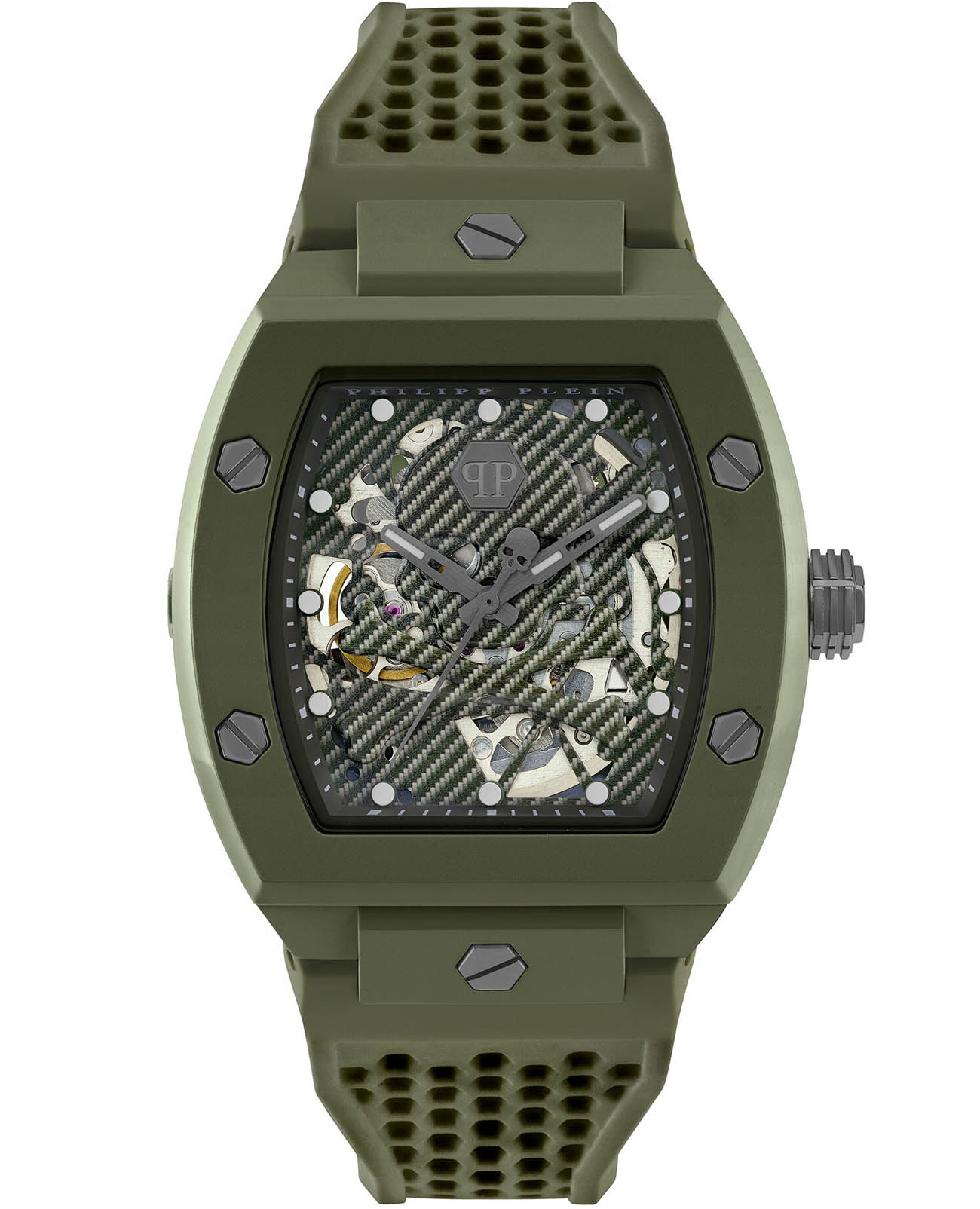 Мужские механические часы-скелетоны Philipp Plein The Skeleton PWVBA0223. Корпус часов изготовлен из экокерамики. Минеральное стеклоМинеральное стеклоМинеральное стекло представляет собой искусственно выращенный минерал кварца. Такое стекло отличается особой устойчивостью к повреждениям и царапинам. Уступает по некоторым качествам сапфировому стеклу. устойчивое к мелким механическим повреждениям. Влагозащита: 50 метров, позволит защитить корпус от случайных брызг или капель дождя. Стрелки и метки с люминесцентным покрытиемЛюминесцентное покрытиеПозволяет считывать показания времени в темноте. Производители наносят на стрелки, часовые индексы, безель или поверхность циферблата светонакопительный состав, дающий холодное свечение.. Практичный ремешок из силикона на стандартной застёжке.
