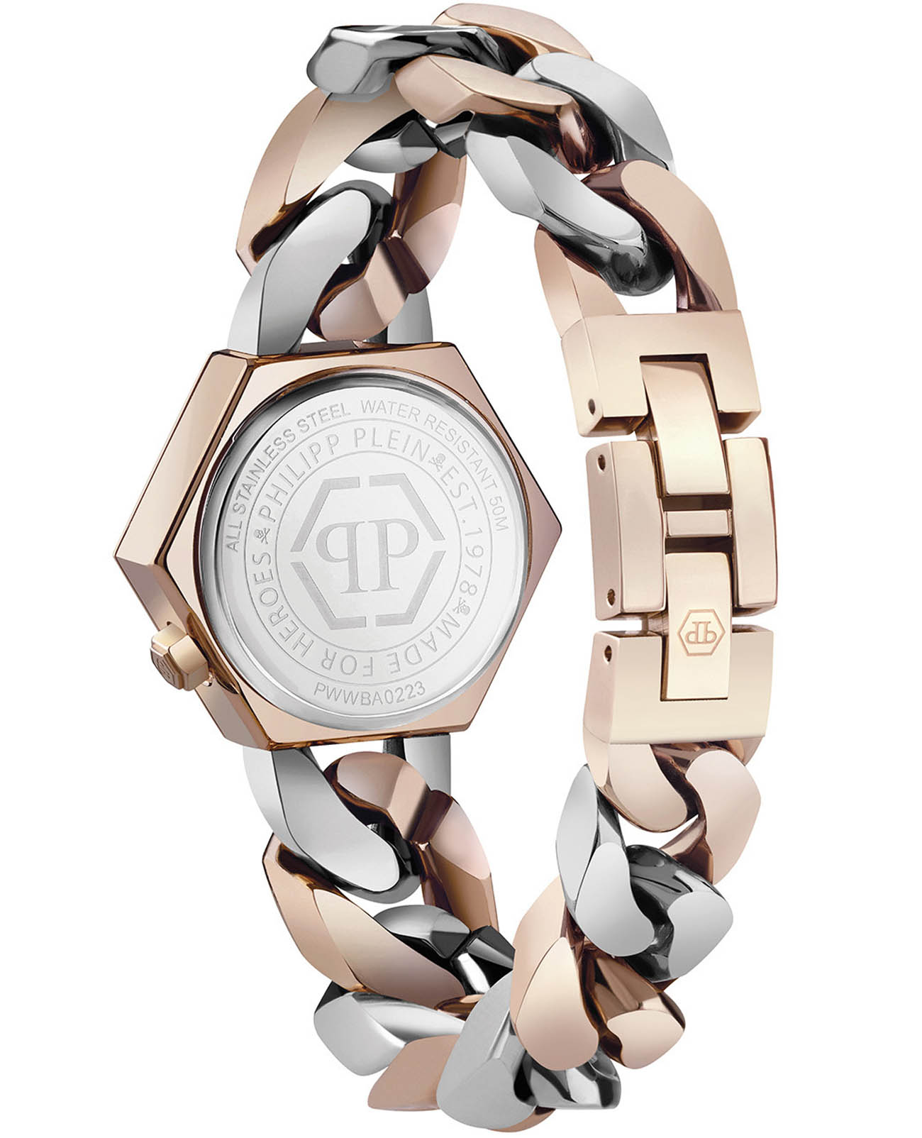 Стильные женские часы Philipp Plein The Hexagon PWWBA0223 с надежным кварцевым механизмом. Корпус и браслет часов изготовлены из нержавеющей стали с IP-покрытиемIP-покрытиеМетод ионного напыления. Демонстрирует повышенную устойчивость к истиранию, окислению и химическим веществам. Под воздействием высокого давления и температуры около 1500°C молекулы металла надёжно соединяются с частицами корпуса часов.. Минеральное стеклоМинеральное стеклоМинеральное стекло представляет собой искусственно выращенный минерал кварца. Такое стекло отличается особой устойчивостью к повреждениям и царапинам. Уступает по некоторым качествам сапфировому стеклу. устойчивое к мелким механическим повреждениям. Влагозащита: 50 метров, позволит защитить корпус от случайных брызг или капель дождя. Циферблат инкрустирован кристаллами Preciosa.