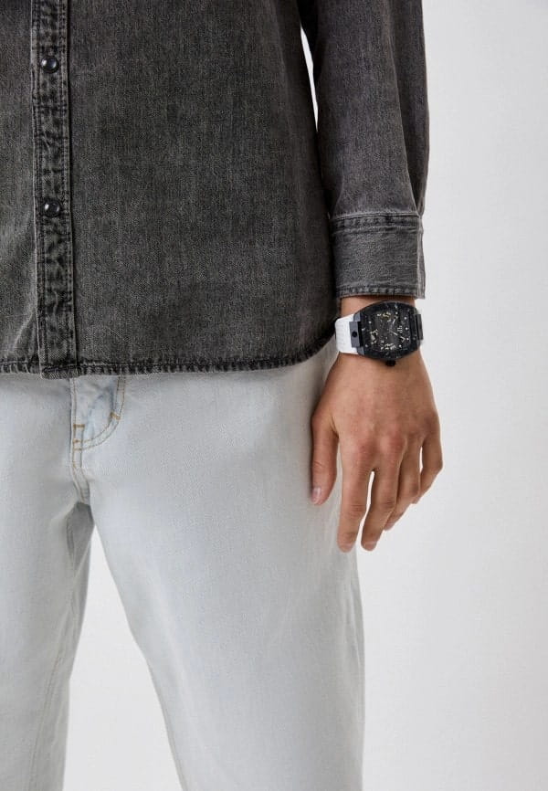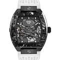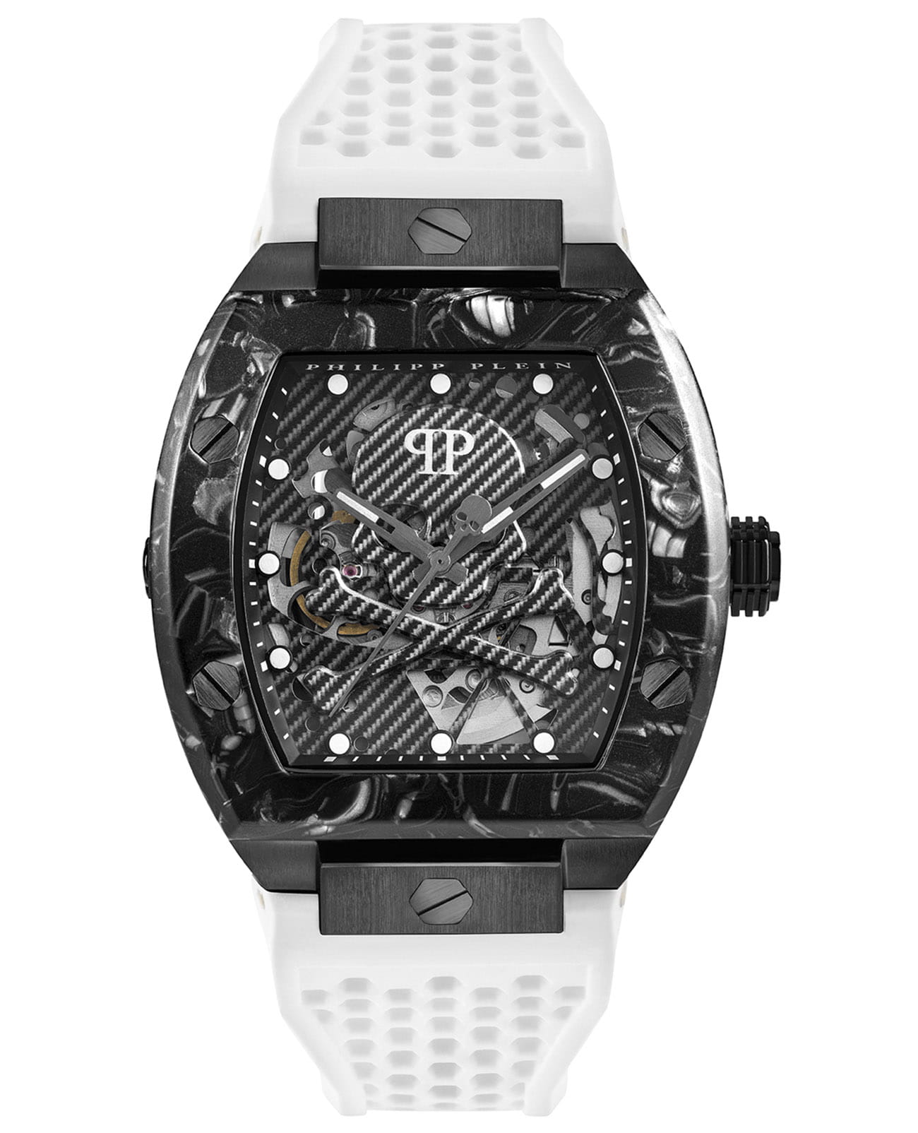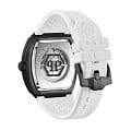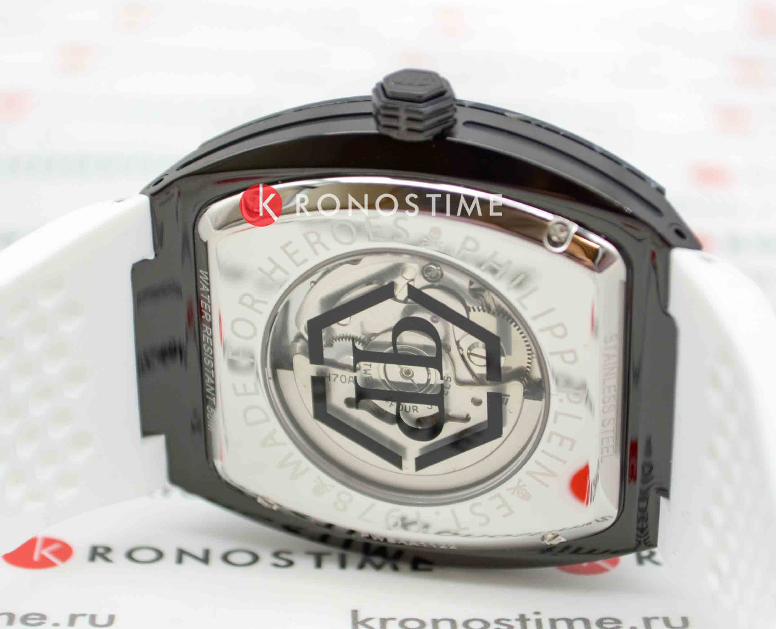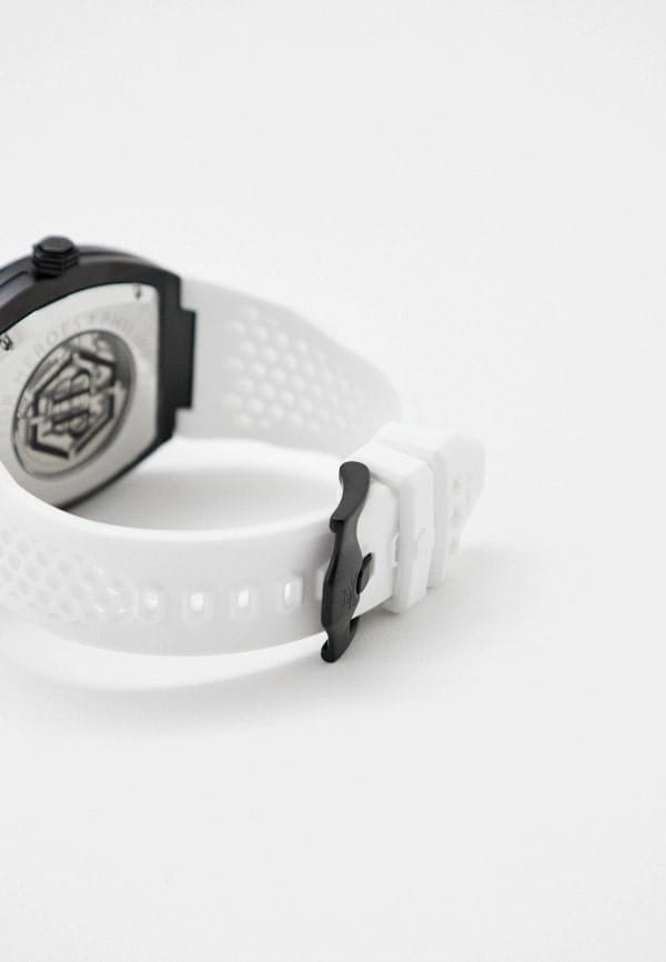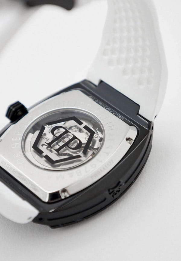 Механические мужские часы-скелетоны с минеральным стекломМинеральное стеклоМинеральное стекло представляет собой искусственно выращенный минерал кварца. Такое стекло отличается особой устойчивостью к повреждениям и царапинам. Уступает по некоторым качествам сапфировому стеклу. Philipp Plein The Skeleton Sport Master PWBAA1122, кварцевый механизм с высокой точностью. Класс водозащиты: 50 метров, позволит защитить корпус от случайных брызг или капель дождя. Корпус часов изготовлен из стали с IP-покрытиемIP-покрытиеМетод ионного напыления. Демонстрирует повышенную устойчивость к истиранию, окислению и химическим веществам. Под воздействием высокого давления и температуры около 1500°C молекулы металла надёжно соединяются с частицами корпуса часов.. Силиконовый ремешок на стандартной застёжке. Высококачественный силиконовый браслет обеспечивает высокий уровень комфорта. Стрелки и метки с люминесцентным покрытиемЛюминесцентное покрытиеПозволяет считывать показания времени в темноте. Производители наносят на стрелки, часовые индексы, безель или поверхность циферблата светонакопительный состав, дающий холодное свечение..