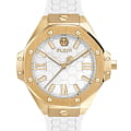 Philipp Plein Plein Lady Royal PWBDA0224 — это женские часы, сочетающие элегантность и практичность. Корпус диаметром 39 мм выполнен из нержавеющей стали с золотистым PVD-покрытиемPVDУльтратонкое покрытие наносится в технике вакуумного напыления, сочетает в себе нитрид титана особой прочности со слоем золота или оксида хрома. Несёт в себе декоративную или защитную функцию., что придаёт часам роскошный вид. Минеральное стеклоМинеральное стеклоМинеральное стекло представляет собой искусственно выращенный минерал кварца. Такое стекло отличается особой устойчивостью к повреждениям и царапинам. Уступает по некоторым качествам сапфировому стеклу. защищает циферблат от царапин и повреждений, сохраняя его безупречный внешний вид. Белый циферблат с римскими цифрами подчёркивает классический стиль. Часы оснащены кварцевым механизмом, который обеспечивает точность хода. Водозащита до 5 ATM (50 метров) позволяет использовать часы в повседневной жизни. Ремешок выполнен из белого силикона, обеспечивая комфортное ношение. Застёжка с классической пряжкой гарантирует надёжную фиксацию. Ширина ремешка 20 мм идеально гармонирует с размером корпуса, завершая изысканный образ.