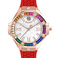 Philipp Plein Plein Lady Royal PWBDA0524 — стильные женские часы, сочетающие элегантный дизайн и функциональность. Корпус диаметром 39 мм выполнен из нержавеющей стали с розовым PVD-покрытиемPVDУльтратонкое покрытие наносится в технике вакуумного напыления, сочетает в себе нитрид титана особой прочности со слоем золота или оксида хрома. Несёт в себе декоративную или защитную функцию., что придаёт часам роскошный вид. Минеральное стеклоМинеральное стеклоМинеральное стекло представляет собой искусственно выращенный минерал кварца. Такое стекло отличается особой устойчивостью к повреждениям и царапинам. Уступает по некоторым качествам сапфировому стеклу. защищает циферблат от царапин, сохраняя его безупречный внешний вид. Циферблат инкрустирован кристаллами. Серебристый циферблат с шестиугольной текстурой подчёркивает фирменный стиль бренда. Часы оснащены кварцевым механизмом, который гарантирует точность хода. Водозащита до 5 ATM (50 метров) делает часы подходящими для повседневного использования. Ремешок из красного силикона обеспечивает комфортное ношение и надёжную фиксацию благодаря классической застёжке. Ширина ремешка 16 мм гармонично дополняет корпус, завершая стильный и современный образ.