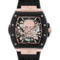 Philipp Plein The $keleton 2.0 PWJFA0225 - это дерзкие и бескомпромиссные часы, воплощающие бунтарский дух бренда. Их отличает узнаваемый мотив черепа, ставший визитной карточкой Philipp Plein, искусно интегрированный в дизайн циферблата. Скелетонизированные мужские механические часы с автоподзаводом. Бочкообразный стальной корпус диаметром 44 мм с PVD-покрытиемPVDУльтратонкое покрытие наносится в технике вакуумного напыления, сочетает в себе нитрид титана особой прочности со слоем золота или оксида хрома. Несёт в себе декоративную или защитную функцию.. Силиконовый ремешок на стандартной застёжке обеспечивает надёжную фиксацию и комфортное ношение. Люминесцентное покрытиеЛюминесцентное покрытиеПозволяет считывать показания времени в темноте. Производители наносят на стрелки, часовые индексы, безель или поверхность циферблата светонакопительный состав, дающий холодное свечение. стрелок и меток позволит следить за временем даже в полной темноте. Метки в виде точек. Минеральное стеклоМинеральное стеклоМинеральное стекло представляет собой искусственно выращенный минерал кварца. Такое стекло отличается особой устойчивостью к повреждениям и царапинам. Уступает по некоторым качествам сапфировому стеклу. защищает циферблат от царапин. Граненая заводная головка. Влагозащита: 50 метров, позволит защитить корпус от случайных брызг или капель дождя. Идеальный аксессуар для тех, кто ценит индивидуальность и не боится выделяться из толпы.