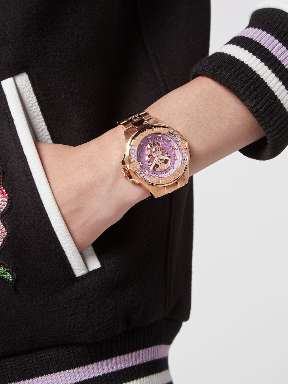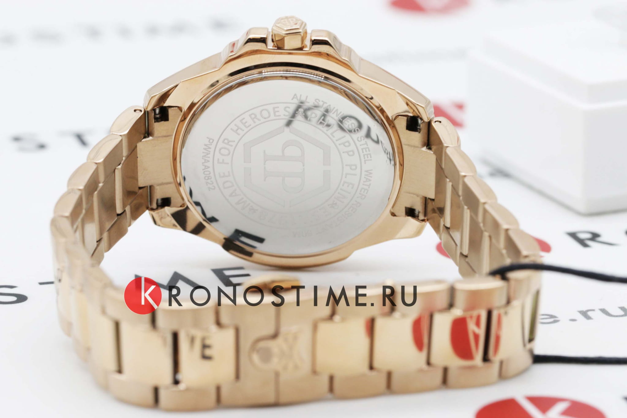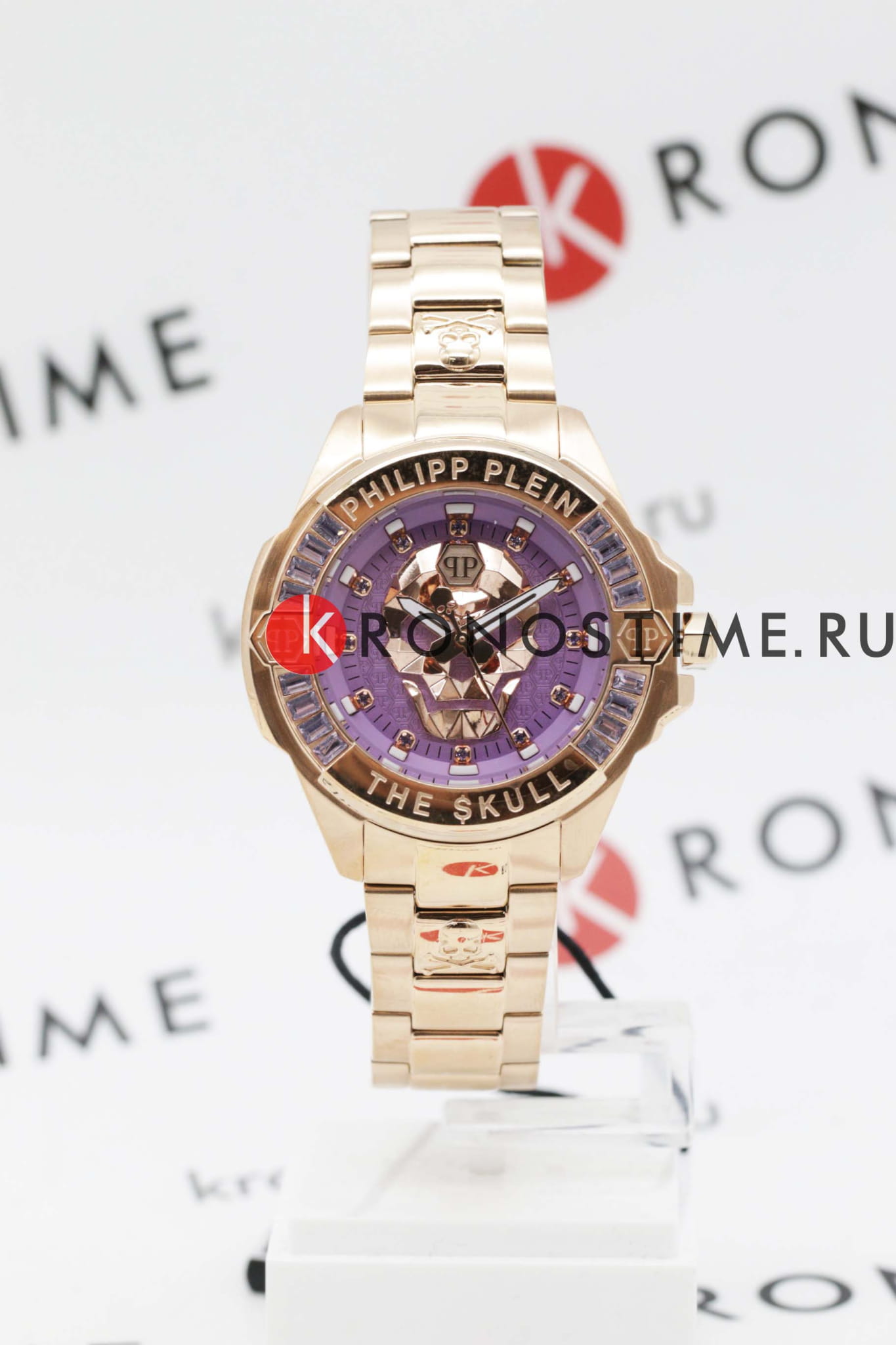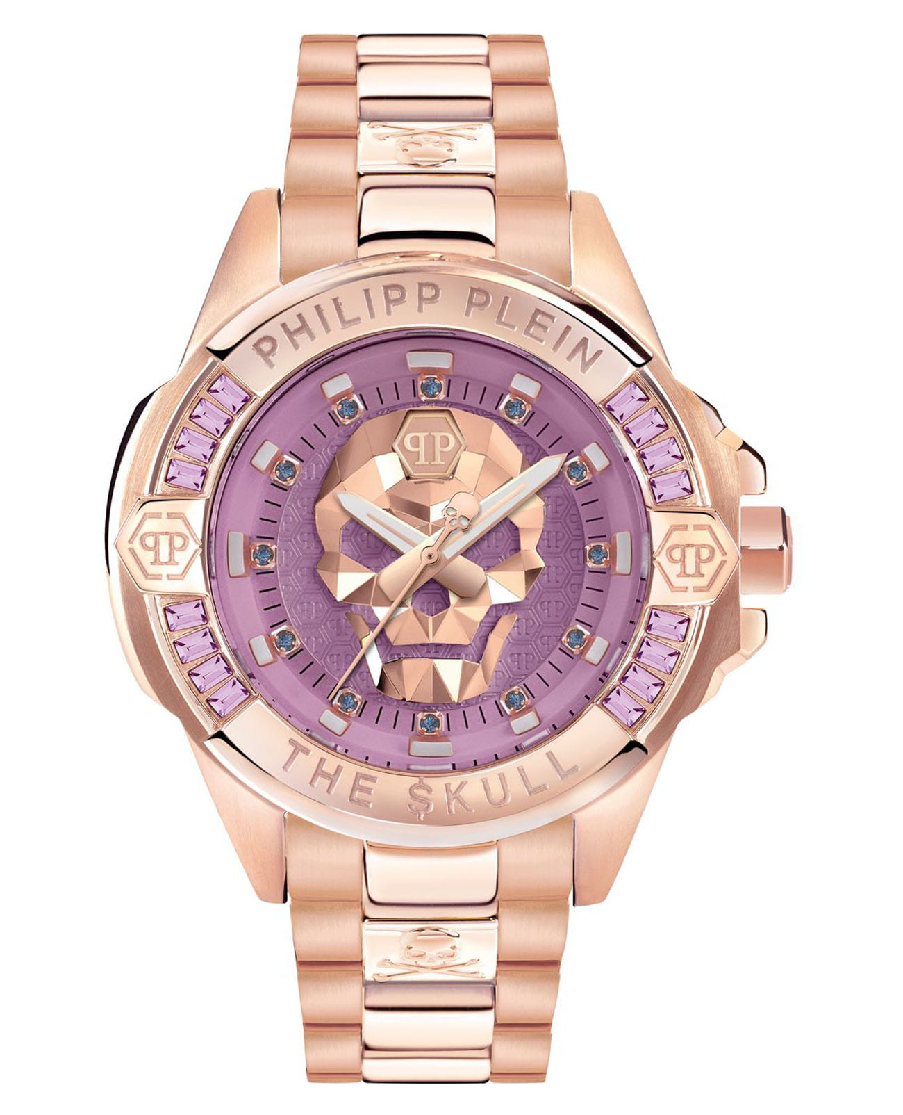 Яркие унисекс часы с минеральным стекломМинеральное стеклоМинеральное стекло представляет собой искусственно выращенный минерал кварца. Такое стекло отличается особой устойчивостью к повреждениям и царапинам. Уступает по некоторым качествам сапфировому стеклу. Philipp Plein The Skull PWNAA0822, кварцевый механизм с высокой точностью. Класс водозащиты: 50 метров, позволит защитить корпус от случайных брызг или капель дождя. Корпус часов изготовлен из стали с IP-покрытиемIP-покрытиеМетод ионного напыления. Демонстрирует повышенную устойчивость к истиранию, окислению и химическим веществам. Под воздействием высокого давления и температуры около 1500°C молекулы металла надёжно соединяются с частицами корпуса часов.. Круглый стальной корпус украшен кристаллами Swarovski. Циферблат с метками в виде точек украшенных кристаллами Swarovski, дополнен трехмерным граненым черепом. Шестигранная заводная головка с защитой. Застёжка бабочка с кнопкамиЗастёжка "бабочка"Такой вид застёжки дополняется предохранителями, помогающими избежать случайного раскрытия браслета. Обладают изящным исполнением. .