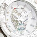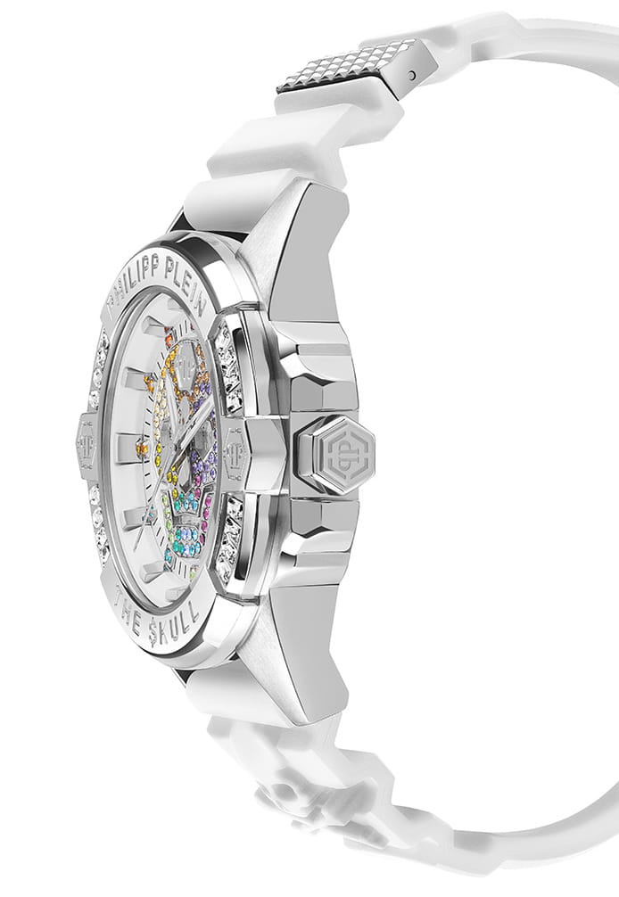 Яркие женские часы с минеральным стекломМинеральное стеклоМинеральное стекло представляет собой искусственно выращенный минерал кварца. Такое стекло отличается особой устойчивостью к повреждениям и царапинам. Уступает по некоторым качествам сапфировому стеклу. Philipp Plein The Skull PWNAA1023, кварцевый механизм с высокой точностью. Класс водозащиты: 50 метров, позволит защитить корпус от случайных брызг или капель дождя. Корпус часов изготовлен из стали. Круглый стальной корпус украшен кристаллами Swarovski. Циферблат с метками в виде точек украшенных кристаллами Swarovski, дополнен черепом из кристаллов. Шестигранная заводная головка с защитой. Силиконовый ремешок украшен объемным черепом.