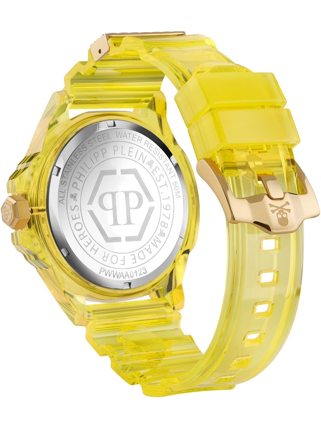 Модель Philipp Plein PWWAA0123 из коллекции The $kull Scuba Duba Edition — это выразительный аксессуар, сочетающий в себе смелый дизайн и функциональность. Корпус диаметром 44 мм выполнен из пластика, подчёркивая современный стиль модели. Чёрный циферблат с фирменным черепом Philipp Plein придаёт часам характерный вид.