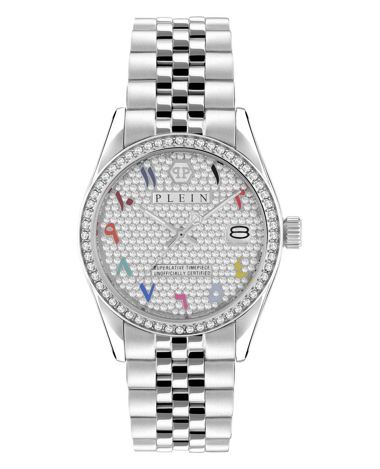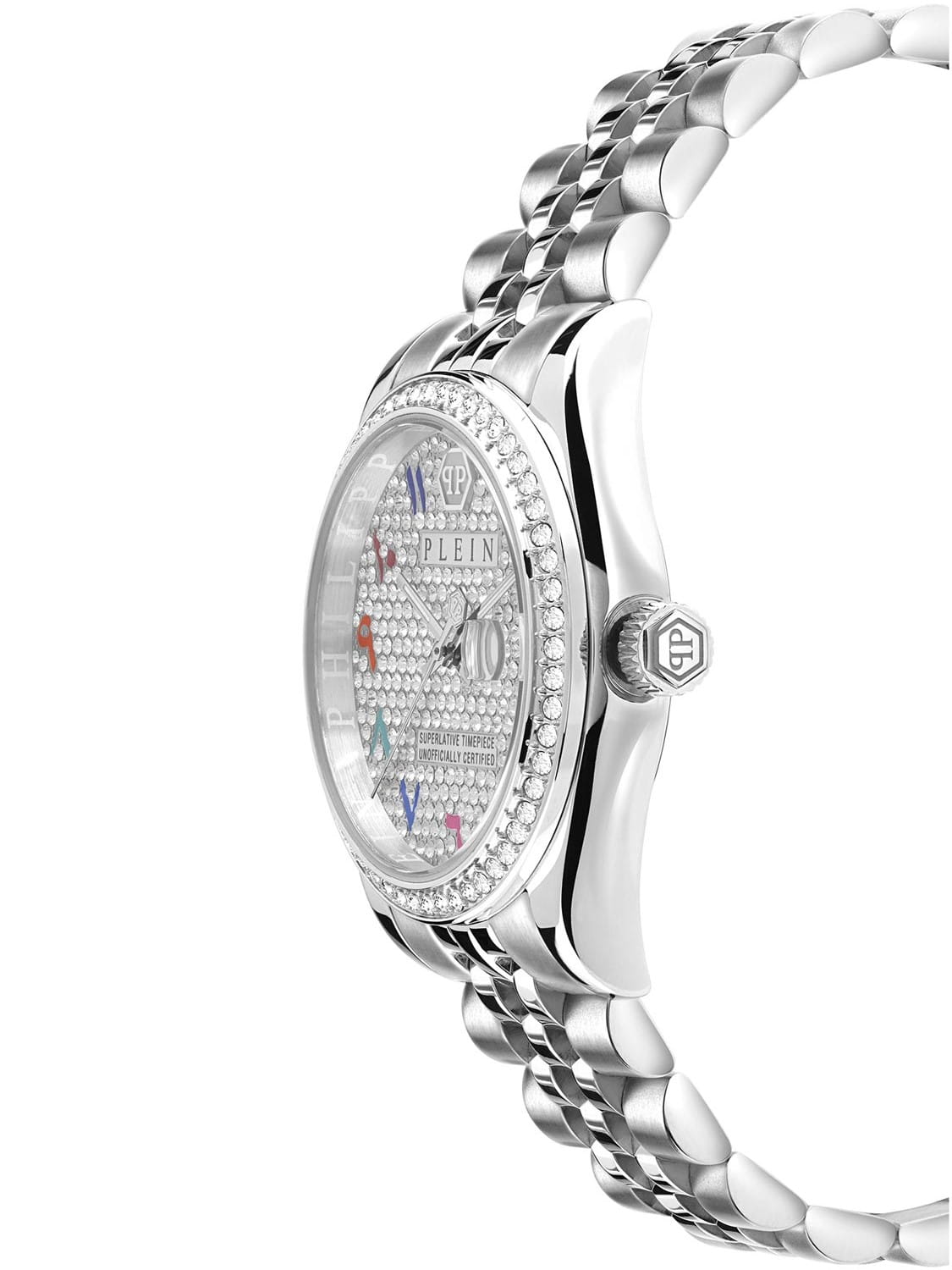 Яркие женские часы Philipp Plein Date Superlative PWYAA0723 c с минеральным стекломМинеральное стеклоМинеральное стекло представляет собой искусственно выращенный минерал кварца. Такое стекло отличается особой устойчивостью к повреждениям и царапинам. Уступает по некоторым качествам сапфировому стеклу.. Особенные часы для особенных женщин! Ослепительный аксессуар, демонстрирующий роскошь и изысканность.Часы с круглым стальным корпусом. Перламутровый циферблат с метками в виде точек, украшенных кристаллами. Люминесцентное покрытиеЛюминесцентное покрытиеПозволяет считывать показания времени в темноте. Производители наносят на стрелки, часовые индексы, безель или поверхность циферблата светонакопительный состав, дающий холодное свечение. стрелок. Окошко даты с увеличительным стеклом находится в положении 3 часа. Рифленая заводная головка. Стальной браслет на застёжке бабочка с кнопкамиЗастёжка "бабочка"Такой вид застёжки дополняется предохранителями, помогающими избежать случайного раскрытия браслета. Обладают изящным исполнением.