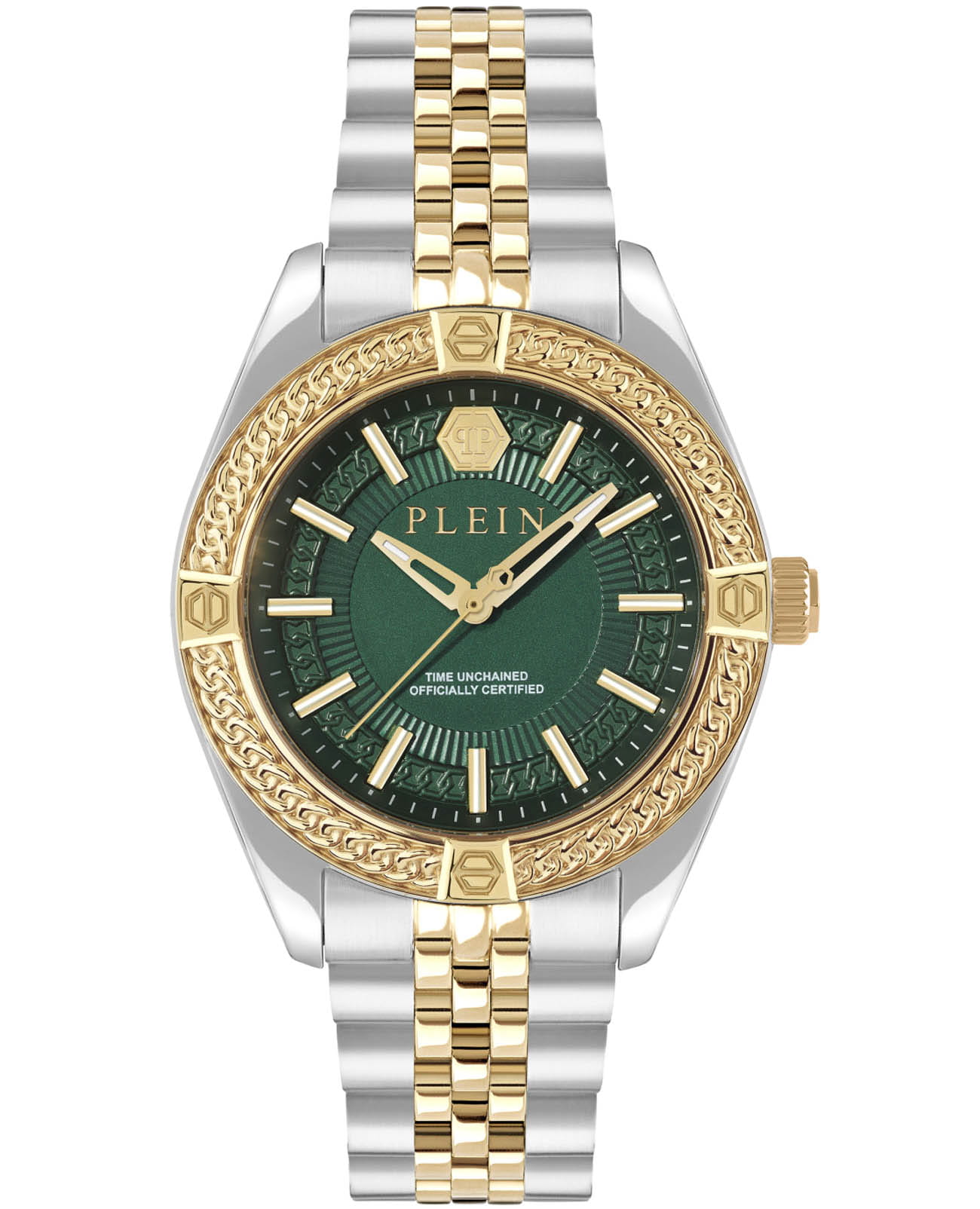Philipp Plein Plein Icon Chain PWZFA0225 - часы в современном дизайне несомненно добавят вам выразительности и станут главным акцентом вашего стильного образа. Мужские кварцевые часы с высокой точностью. Круглый стальной корпус серебристого цвета, диаметром 43 мм. Циферблат декорирован логотипом бренда в положении 12 часов, метки в виде штрихов. Минеральное стеклоМинеральное стеклоМинеральное стекло представляет собой искусственно выращенный минерал кварца. Такое стекло отличается особой устойчивостью к повреждениям и царапинам. Уступает по некоторым качествам сапфировому стеклу. защищает циферблат от царапин. БезельБезельВнешний ободок, закрепляющий стекло. В спортивных часах так называется поворотное кольцо с делениями на циферблате, выполняет роль таймера – замеряет отрезки времени на шкале. Неподвижный безель – элемент декора. Однонаправленно вращающийся безель на дайверских часах позволяет фиксировать моменты погружения и выныривания на поверхность. с PVD-покрытиемPVDУльтратонкое покрытие наносится в технике вакуумного напыления, сочетает в себе нитрид титана особой прочности со слоем золота или оксида хрома. Несёт в себе декоративную или защитную функцию. золотистого цвета. Люминесцентное покрытиеЛюминесцентное покрытиеПозволяет считывать показания времени в темноте. Производители наносят на стрелки, часовые индексы, безель или поверхность циферблата светонакопительный состав, дающий холодное свечение. стрелок позволит следить за временем даже в полной темноте. Стальной браслет с частичным PVD-покрытиемPVDУльтратонкое покрытие наносится в технике вакуумного напыления, сочетает в себе нитрид титана особой прочности со слоем золота или оксида хрома. Несёт в себе декоративную или защитную функцию. на застёжке-бабочке с кнопкамиЗастёжка "бабочка"Такой вид застёжки дополняется предохранителями, помогающими избежать случайного раскрытия браслета. Обладают изящным исполнением. , обеспечивает комфортное ношение. Граненая заводная головка. Влагозащита: 50 метров, позволит защитить корпус от случайных брызг или капель дождя. Идеальный аксессуар для тех, кто ценит индивидуальность и не боится выделяться из толпы.