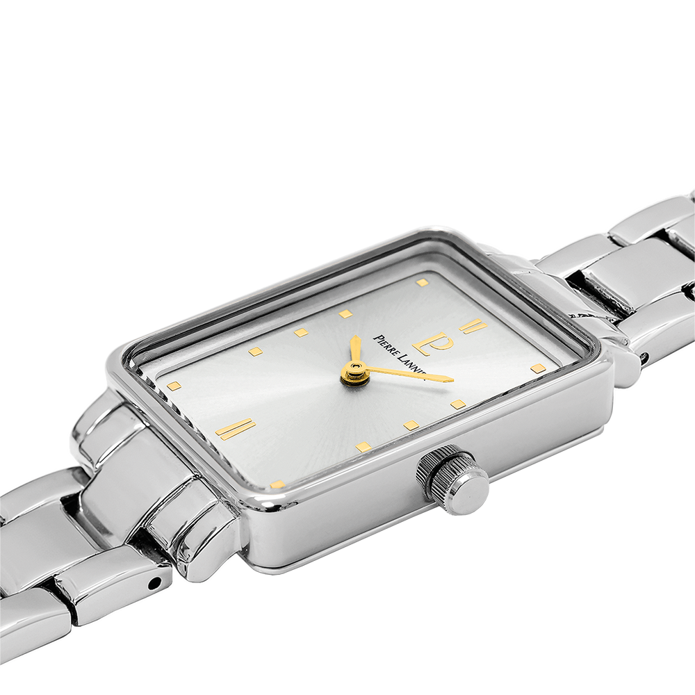 Женские  Pierre Lannier Ariane 051J621. Минеральное стеклоМинеральное стеклоМинеральное стекло представляет собой искусственно выращенный минерал кварца. Такое стекло отличается особой устойчивостью к повреждениям и царапинам. Уступает по некоторым качествам сапфировому стеклу. устойчивое к мелким механическим повреждениям. Центральные часовая, минутная и секундная стрелки. Корпус выполнен из полированной нержавеющей стали. Водостойкость: 30 метров, позволит защитить корпус от случайных брызг или капель дождя. Размер корпуса составляет 21 х 28,4 мм, толщина 6,2 мм. Стальной браслет на раскладной застёжкеРаскладная застёжкаТакой тип застёжки используется только на браслетах из металла. Она никогда не раскрывается полностью, происходит разделение на 2 и более частей. Раскладывающая застёжка снизит вероятность потери часов к минимуму..