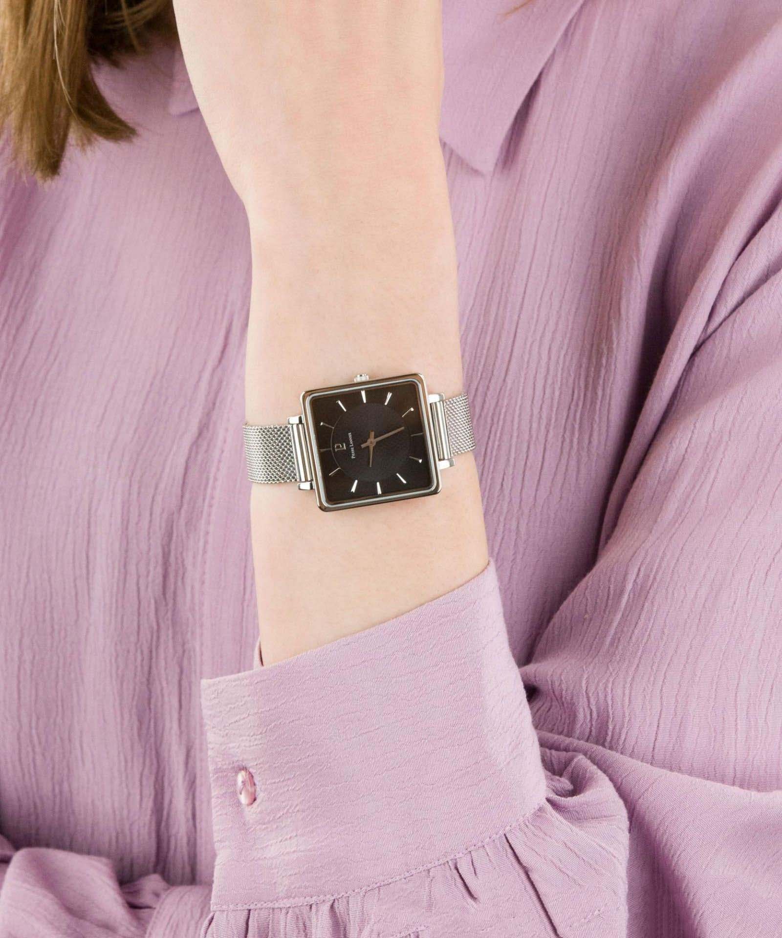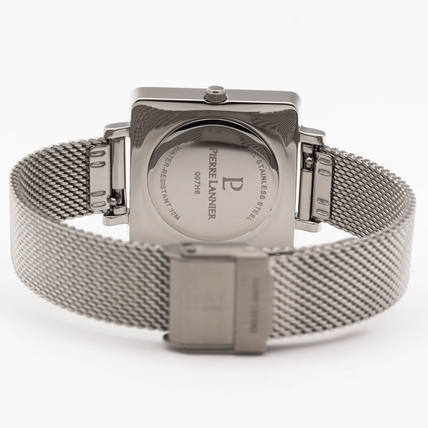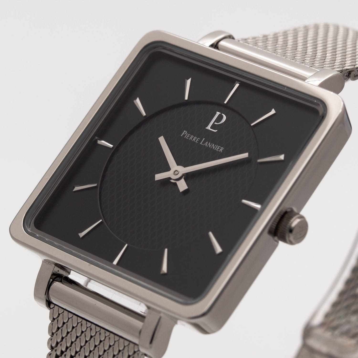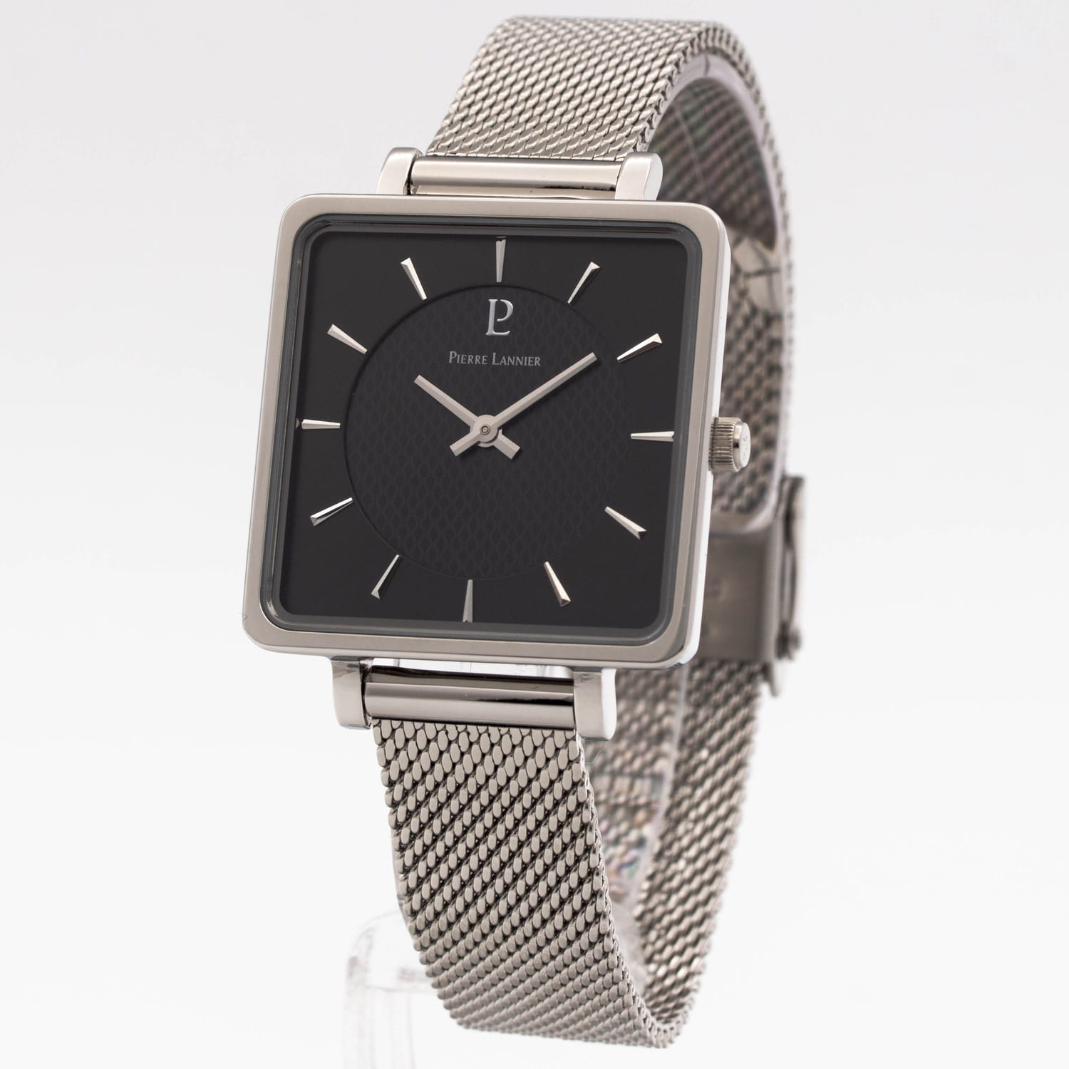 Женские кварцевые часы Pierre Lannier LeCare 007H638. Центральные часовая и минутная стрелки. Черный циферблат. Квадратный корпус выполнен из полированной нержавеющей стали. Стальной браслет выполнен в технике миланского плетения, раскладная застёжкаРаскладная застёжкаТакой тип застёжки используется только на браслетах из металла. Она никогда не раскрывается полностью, происходит разделение на 2 и более частей. Раскладывающая застёжка снизит вероятность потери часов к минимуму.. Прочное минеральное стеклоМинеральное стеклоМинеральное стекло представляет собой искусственно выращенный минерал кварца. Такое стекло отличается особой устойчивостью к повреждениям и царапинам. Уступает по некоторым качествам сапфировому стеклу., устойчивое к мелким механическим повреждениям. Водостойкость: 30 метров, позволит защитить корпус от случайных брызг или капель дождя.