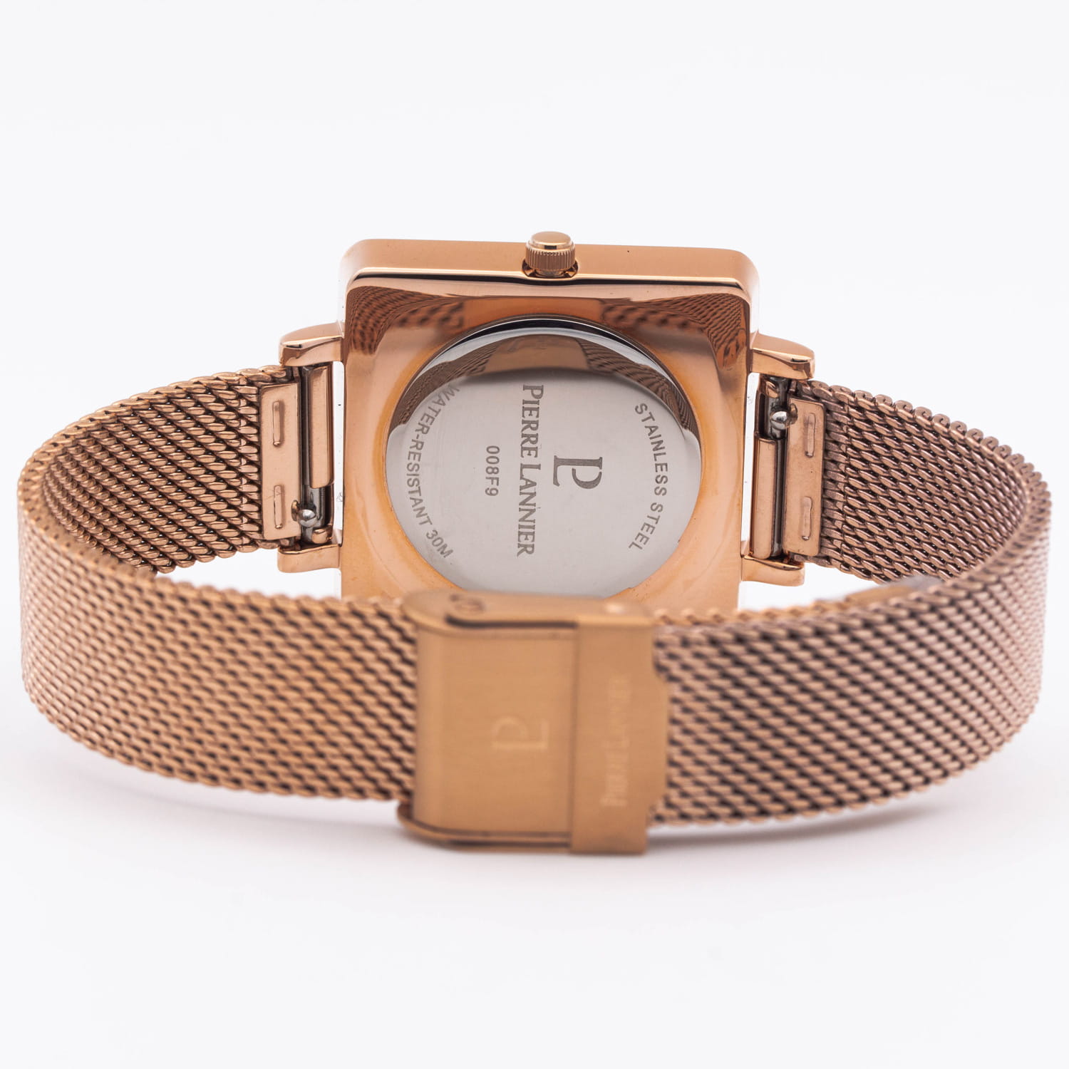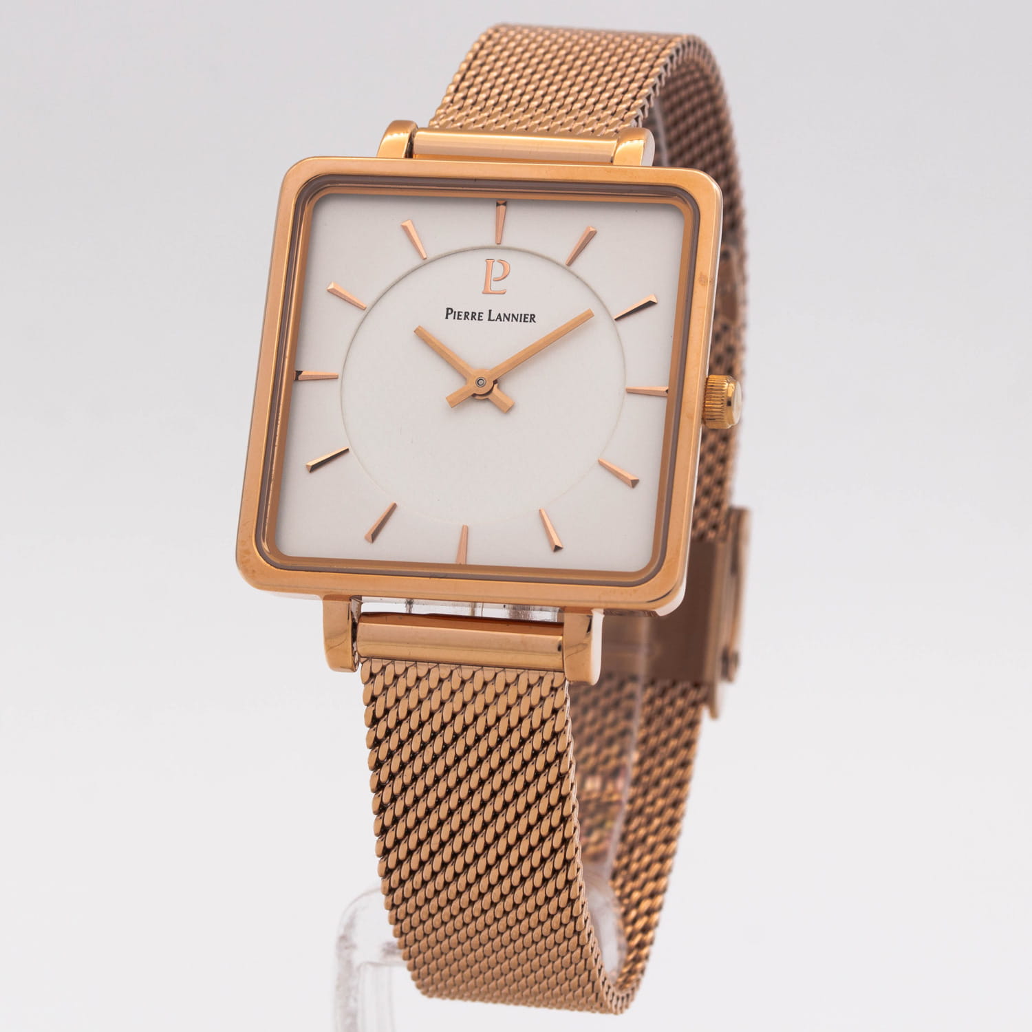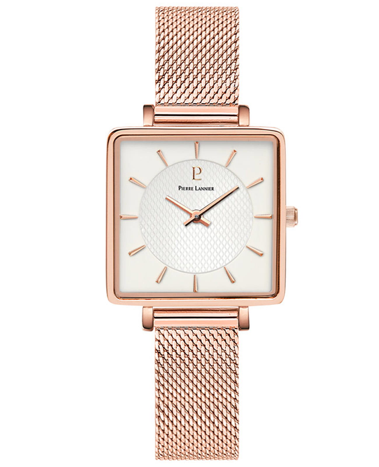 Женские кварцевые часы Pierre Lannier LeCare 008F928. Центральные часовая и минутная стрелки. Белый текстурированный циферблат. Квадратный корпус выполнен из полированной нержавеющей стали с PVD-покрытиемPVDУльтратонкое покрытие наносится в технике вакуумного напыления, сочетает в себе нитрид титана особой прочности со слоем золота или оксида хрома. Несёт в себе декоративную или защитную функцию.. Стальной браслет выполнен в технике миланского плетения, раскладная застёжкаРаскладная застёжкаТакой тип застёжки используется только на браслетах из металла. Она никогда не раскрывается полностью, происходит разделение на 2 и более частей. Раскладывающая застёжка снизит вероятность потери часов к минимуму.. Прочное минеральное стеклоМинеральное стеклоМинеральное стекло представляет собой искусственно выращенный минерал кварца. Такое стекло отличается особой устойчивостью к повреждениям и царапинам. Уступает по некоторым качествам сапфировому стеклу., устойчивое к мелким механическим повреждениям. Водостойкость: 30 метров, позволит защитить корпус от случайных брызг или капель дождя.
