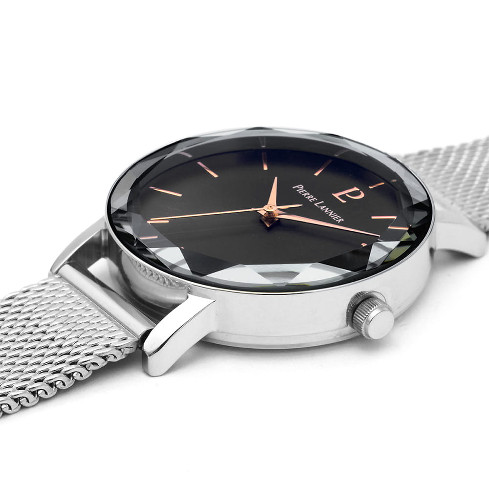 Женские кварцевые часы Pierre Lannier Multiples 009M688. Центральные часовая,минутная и секундная стрелки. Черный циферблат. Круглый корпус выполнен из полированной нержавеющей стали с фактурой по безелюБезельВнешний ободок, закрепляющий стекло. В спортивных часах так называется поворотное кольцо с делениями на циферблате, выполняет роль таймера – замеряет отрезки времени на шкале. Неподвижный безель – элемент декора. Однонаправленно вращающийся безель на дайверских часах позволяет фиксировать моменты погружения и выныривания на поверхность.. Стальной браслет выполнен в технике миланского плетения, раскладная застёжкаРаскладная застёжкаТакой тип застёжки используется только на браслетах из металла. Она никогда не раскрывается полностью, происходит разделение на 2 и более частей. Раскладывающая застёжка снизит вероятность потери часов к минимуму.. Прочное минеральное стеклоМинеральное стеклоМинеральное стекло представляет собой искусственно выращенный минерал кварца. Такое стекло отличается особой устойчивостью к повреждениям и царапинам. Уступает по некоторым качествам сапфировому стеклу., устойчивое к мелким механическим повреждениям. Водостойкость: 50 метров, позволит защитить корпус от случайных брызг или капель дождя.