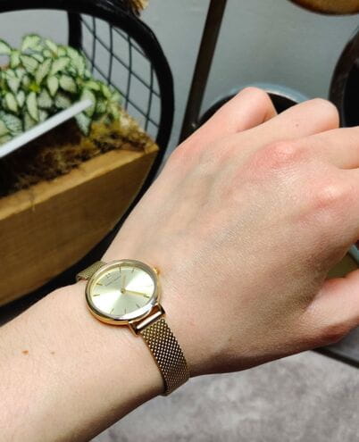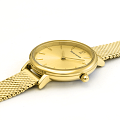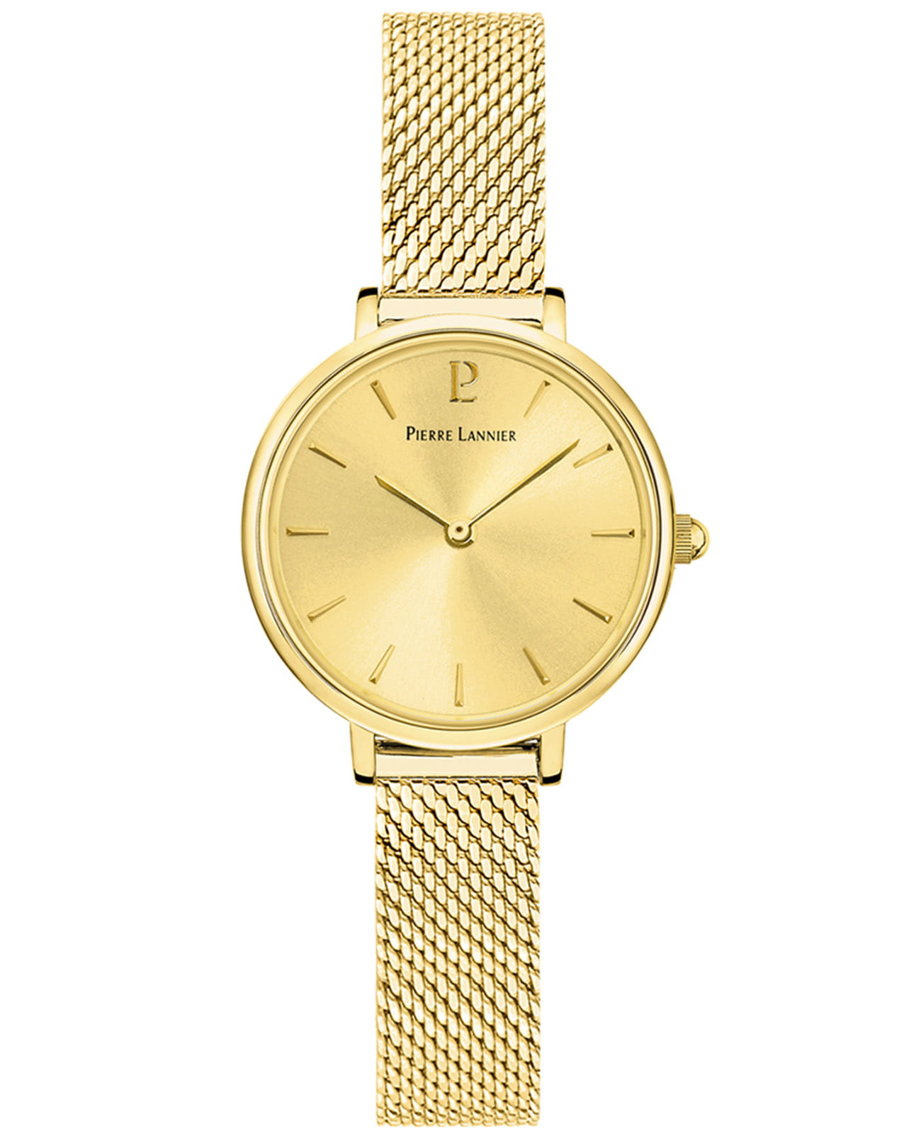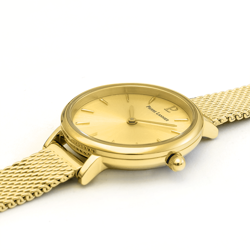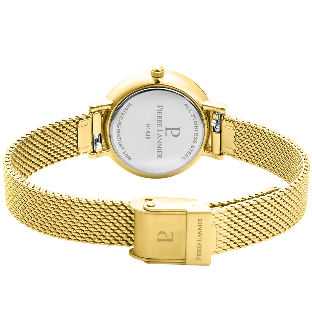 Женские кварцевые часы Pierre Lannier Nova 014J548. Центральные часовая и минутная стрелки. Золотистый циферблат. Круглый корпус выполнен из полированной нержавеющей стали с фактурой по безелюБезельВнешний ободок, закрепляющий стекло. В спортивных часах так называется поворотное кольцо с делениями на циферблате, выполняет роль таймера – замеряет отрезки времени на шкале. Неподвижный безель – элемент декора. Однонаправленно вращающийся безель на дайверских часах позволяет фиксировать моменты погружения и выныривания на поверхность. с IP-покрытиемIP-покрытиеМетод ионного напыления. Демонстрирует повышенную устойчивость к истиранию, окислению и химическим веществам. Под воздействием высокого давления и температуры около 1500°C молекулы металла надёжно соединяются с частицами корпуса часов.. Стальной браслет выполнен в технике миланского плетения, раскладная застёжкаРаскладная застёжкаТакой тип застёжки используется только на браслетах из металла. Она никогда не раскрывается полностью, происходит разделение на 2 и более частей. Раскладывающая застёжка снизит вероятность потери часов к минимуму.. Прочное минеральное стеклоМинеральное стеклоМинеральное стекло представляет собой искусственно выращенный минерал кварца. Такое стекло отличается особой устойчивостью к повреждениям и царапинам. Уступает по некоторым качествам сапфировому стеклу., устойчивое к мелким механическим повреждениям. Водостойкость: 30 метров, позволит защитить корпус от случайных брызг или капель дождя.