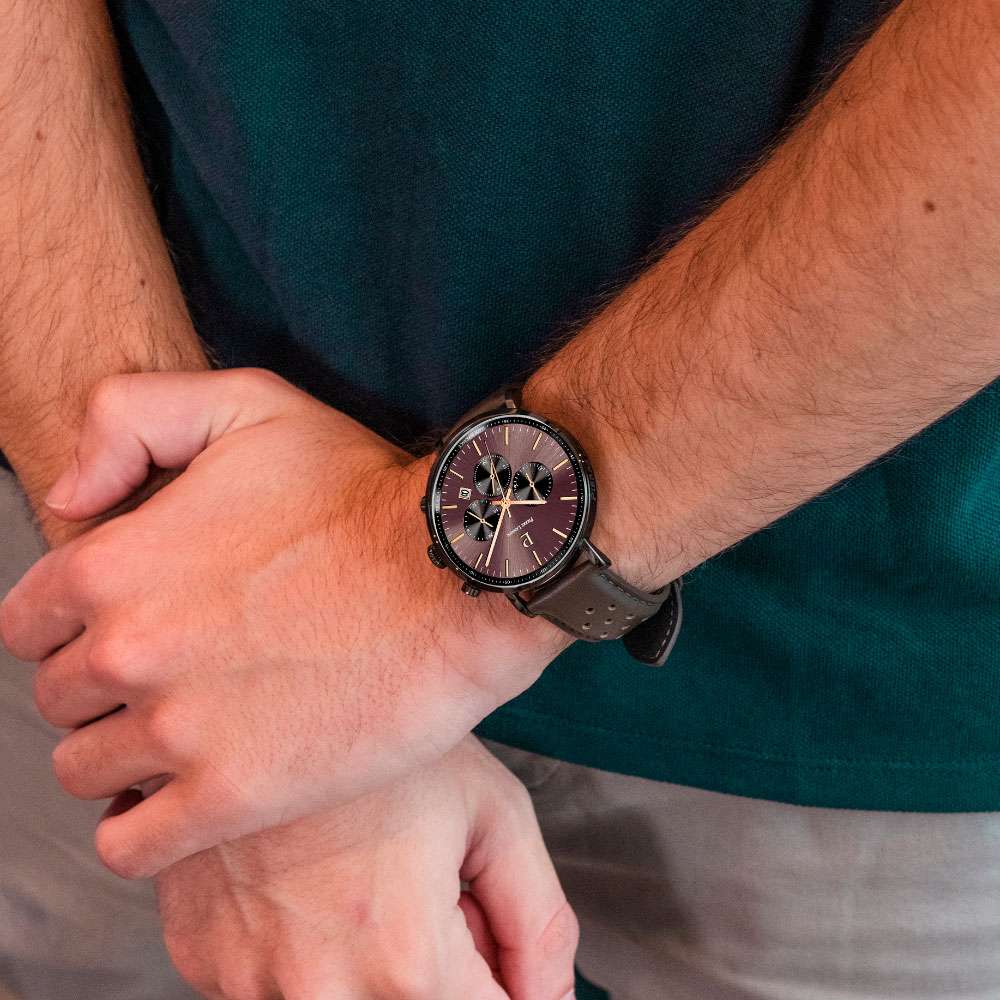 Pierre Lannier Baron 220H490 — выразительный мужской хронограф с индустриальной эстетикой. Диаметр корпуса — 43 мм, выполнен из нержавеющей стали с антрацитовым PVDPVDУльтратонкое покрытие наносится в технике вакуумного напыления, сочетает в себе нитрид титана особой прочности со слоем золота или оксида хрома. Несёт в себе декоративную или защитную функцию.-покрытием, придающим мужественный и современный вид . Циферблат графитового оттенка с эффектом «солнечного луча» украшен тремя функциональными счётчиками: 24‑часовые, секунднометрические и минутные — дополнены аккуратным окном даты между «4 и 5 часами». Чёткие часовые метки и стрелки в золотистом исполнении создают чёткий контраст с тёмным фоном . Циферблат защищён минеральным стекломМинеральное стеклоМинеральное стекло представляет собой искусственно выращенный минерал кварца. Такое стекло отличается особой устойчивостью к повреждениям и царапинам. Уступает по некоторым качествам сапфировому стеклу., устойчивым к повседневным воздействиям. Механизм — надёжный японский кварцевый Miyota (JS25) с функцией хронографа, простой в использовании и обслуживании Ремешок выполнен из перфорированной серой кожи классической ширины 20 мм, обеспечивая комфорт и дыхание коже. Завершён традиционной пряжкой. Водозащита до 5 ATM (≈50 м) позволяет спокойно носить часы в условиях случайных брызг и дождя Baron — это гармония строгого индустриального стиля, универсальности и точной функциональности хронографа, подчеркнутых качественным PVD-покрытием и практичными материалами.