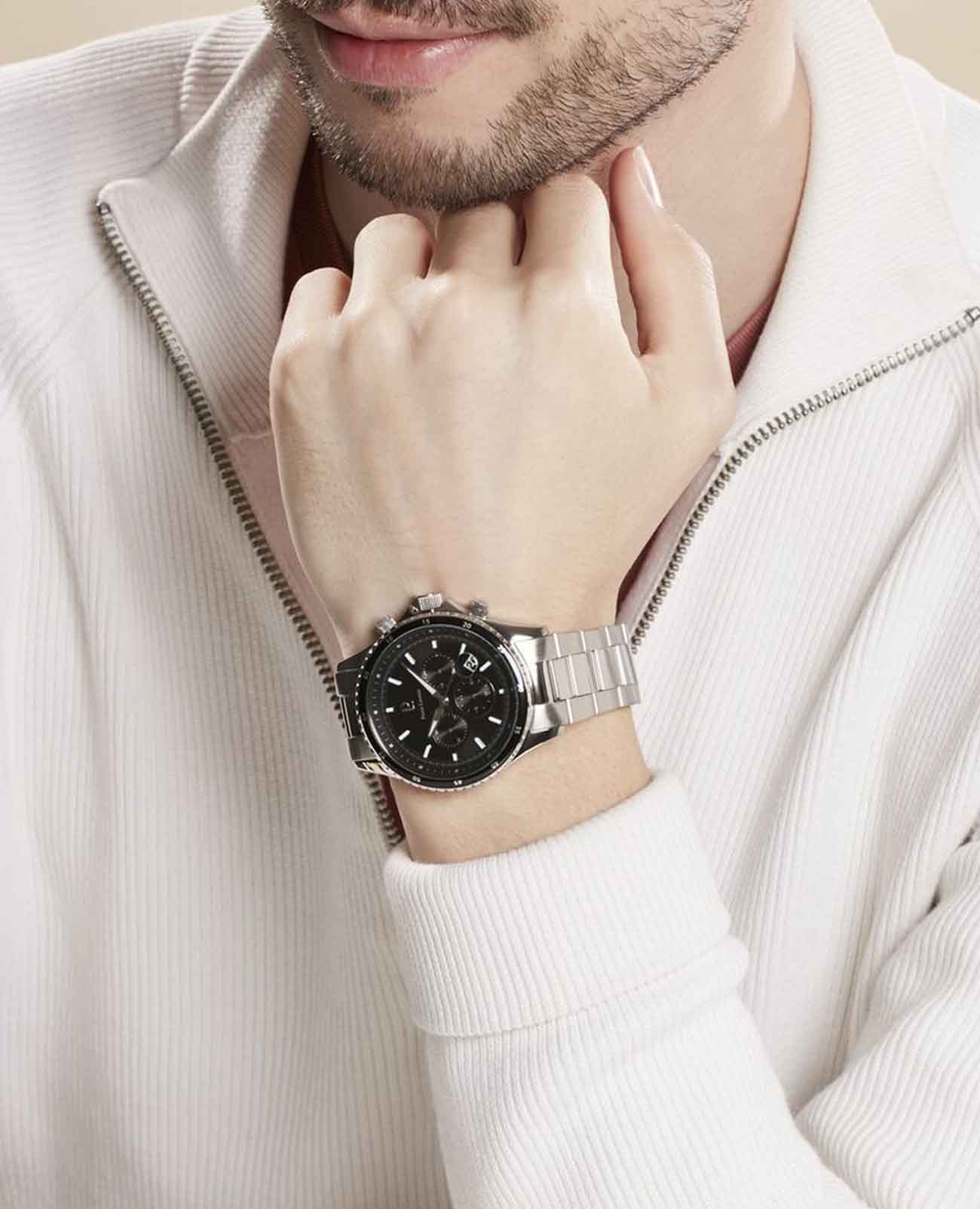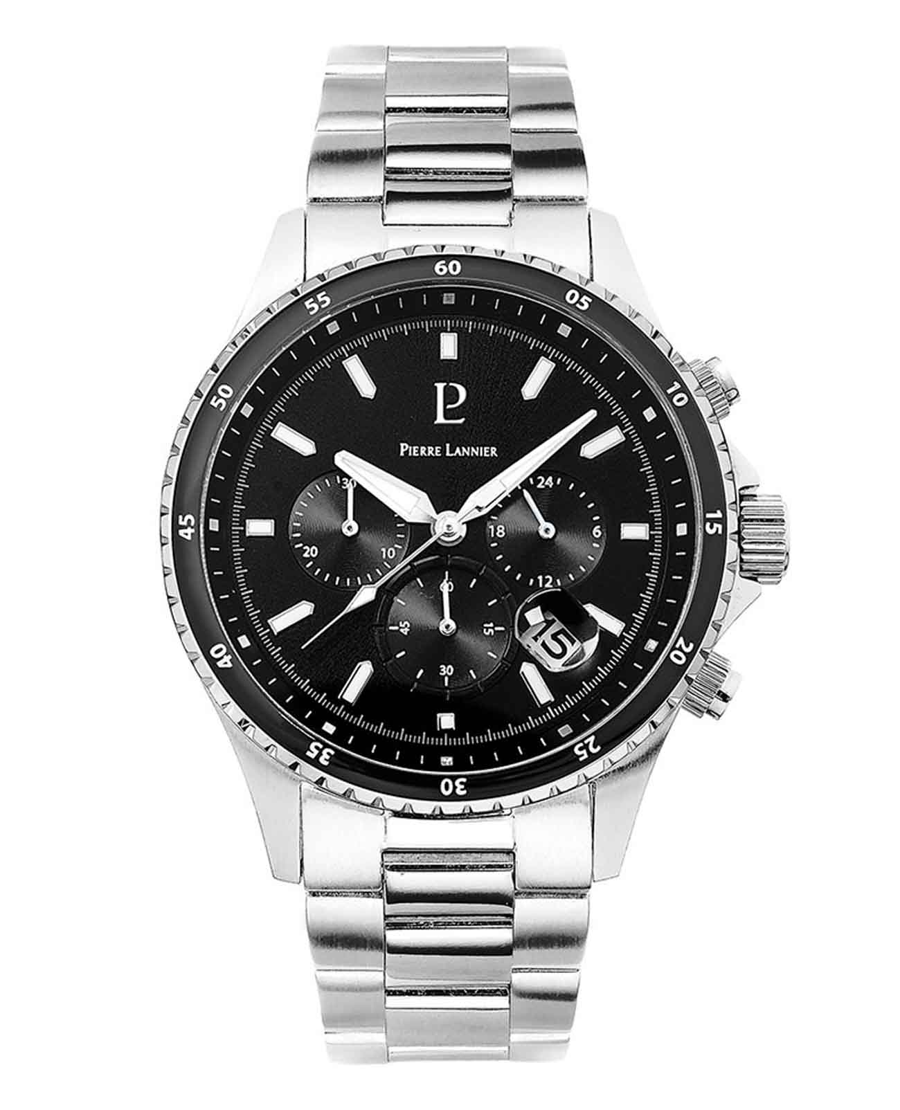 Мужские кварцевые часы Pierre Lannier Cronos 226G131. Часы-хронографХронографФункция позволяет измерять отрезки времени с особой точностью: часы, минуты, секунды. Верным признаком хронографа является наличие на циферблате 3 дополнительных окошек-счётчиков. с секундомеромСекундомерСекундоме́р — прибор, способный измерять интервалы времени с точностью до долей секунды.. Минеральное стеклоМинеральное стеклоМинеральное стекло представляет собой искусственно выращенный минерал кварца. Такое стекло отличается особой устойчивостью к повреждениям и царапинам. Уступает по некоторым качествам сапфировому стеклу. устойчивое к мелким механическим повреждениям. Корпус из нержавеющей стали. БезельБезельВнешний ободок, закрепляющий стекло. В спортивных часах так называется поворотное кольцо с делениями на циферблате, выполняет роль таймера – замеряет отрезки времени на шкале. Неподвижный безель – элемент декора. Однонаправленно вращающийся безель на дайверских часах позволяет фиксировать моменты погружения и выныривания на поверхность. из нержавющей стали с IP-покрытиемIP-покрытиеМетод ионного напыления. Демонстрирует повышенную устойчивость к истиранию, окислению и химическим веществам. Под воздействием высокого давления и температуры около 1500°C молекулы металла надёжно соединяются с частицами корпуса часов.. Центральные часовая и минутная стрелки, секундная стрелка вынесена на малый циферблат. Окошко даты между 4 и 5 часам. Стрелки с люминесцентным покрытиемЛюминесцентное покрытиеПозволяет считывать показания времени в темноте. Производители наносят на стрелки, часовые индексы, безель или поверхность циферблата светонакопительный состав, дающий холодное свечение.. Водостойкость: 100 метров, позволит плавать, нырять и заниматься другими водными видами спорта. Стальной браслет с раскладной застёжкойРаскладная застёжкаТакой тип застёжки используется только на браслетах из металла. Она никогда не раскрывается полностью, происходит разделение на 2 и более частей. Раскладывающая застёжка снизит вероятность потери часов к минимуму..