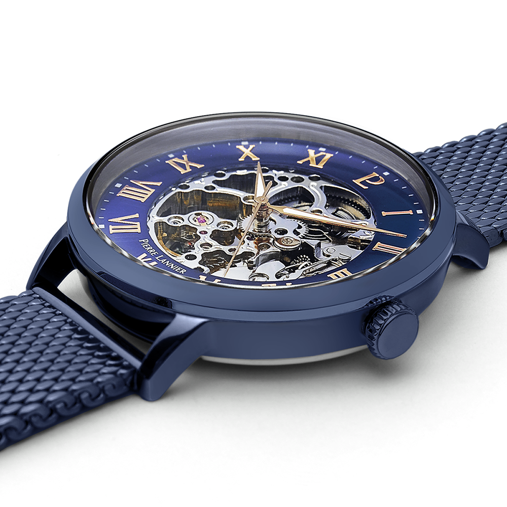 Мужские механические часы с автоподзаводом Pierre Lannier Automatic 318B468. Минеральное стеклоМинеральное стеклоМинеральное стекло представляет собой искусственно выращенный минерал кварца. Такое стекло отличается особой устойчивостью к повреждениям и царапинам. Уступает по некоторым качествам сапфировому стеклу. устойчивое к мелким механическим повреждениям. Центральные часовая, минутная и секундная стрелки. Корпус и браслет выполнены из нержавеющей стали с IP-покрытиемIP-покрытиеМетод ионного напыления. Демонстрирует повышенную устойчивость к истиранию, окислению и химическим веществам. Под воздействием высокого давления и температуры около 1500°C молекулы металла надёжно соединяются с частицами корпуса часов.. Водостойкость: 50 метров, позволит защитить корпус от случайных брызг или капель дождя. Стрелки с люминесцентным покрытиемЛюминесцентное покрытиеПозволяет считывать показания времени в темноте. Производители наносят на стрелки, часовые индексы, безель или поверхность циферблата светонакопительный состав, дающий холодное свечение.. Синий скелетонизированный циферблат. Браслет выполнен в технике миланского плетения на раскладной застёжкеРаскладная застёжкаТакой тип застёжки используется только на браслетах из металла. Она никогда не раскрывается полностью, происходит разделение на 2 и более частей. Раскладывающая застёжка снизит вероятность потери часов к минимуму.. Прозрачная задняя крышка.